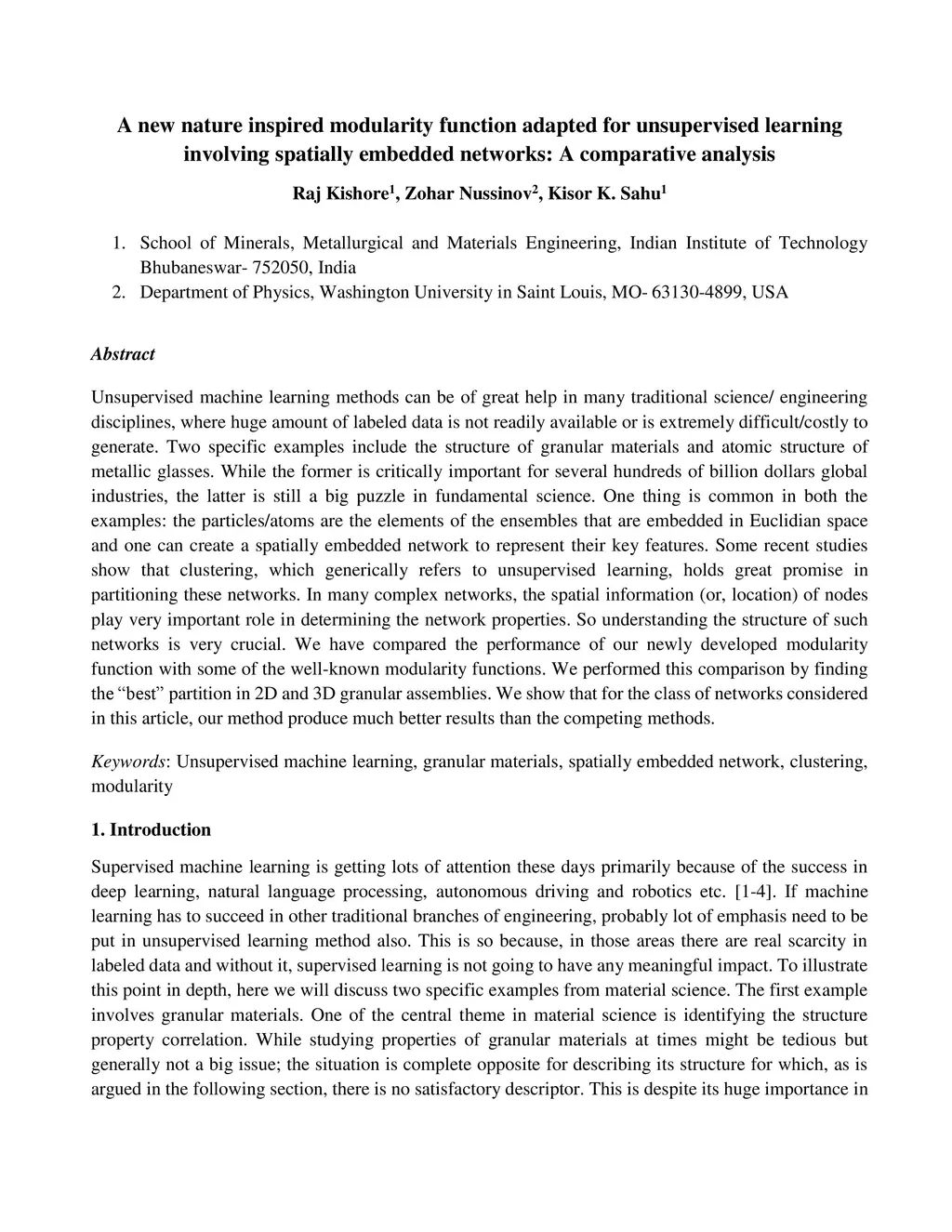 Unsupervised machine learning methods can be of great help in many traditional engineering disciplines, where huge amount of labeled data is not readily available or is extremely difficult or costly to generate. Two specific examples include the structure of granular materials and atomic structure of metallic glasses. While the former is critically important for several hundreds of billion dollars global industries, the latter is still a big puzzle in fundamental science. One thing is common in both the examples is that the particles are the elements of the ensembles that are embedded in Euclidean space and one can create a spatially embedded network to represent their key features. Some recent studies show that clustering, which generically refers to unsupervised learning, holds great promise in partitioning these networks. In many complex networks, the spatial information of nodes play very important role in determining the network properties. So understanding the structure of such networks is very crucial. We have compared the performance of our newly developed modularity function with some of the well-known modularity functions. We performed this comparison by finding the best partition in 2D and 3D granular assemblies. We show that for the class of networks considered in this article, our method produce much better results than the competing methods.