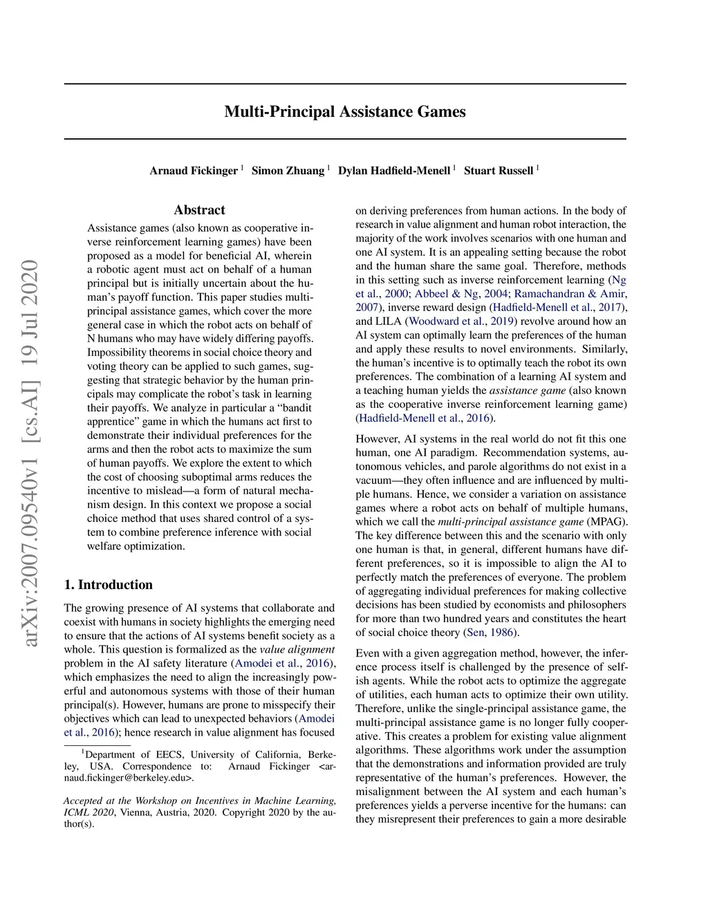 Assistance games (also known as cooperative inverse reinforcement learning games) have been proposed as a model for beneficial AI, wherein a robotic agent must act on behalf of a human principal but is initially uncertain about the humans payoff function. This paper studies multi-principal assistance games, which cover the more general case in which the robot acts on behalf of N humans who may have widely differing payoffs. Impossibility theorems in social choice theory and voting theory can be applied to such games, suggesting that strategic behavior by the human principals may complicate the robots task in learning their payoffs. We analyze in particular a bandit apprentice game in which the humans act first to demonstrate their individual preferences for the arms and then the robot acts to maximize the sum of human payoffs. We explore the extent to which the cost of choosing suboptimal arms reduces the incentive to mislead, a form of natural mechanism design. In this context we propose a social choice method that uses shared control of a system to combine preference inference with social welfare optimization.