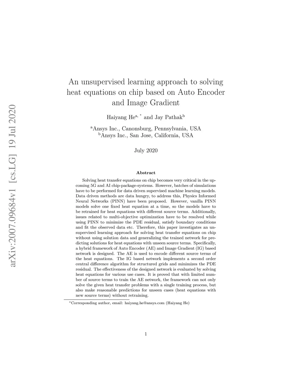 Solving heat transfer equations on chip becomes very critical in the upcoming 5G and AI chip-package-systems. However, batches of simulations have to be performed for data driven supervised machine learning models. Data driven methods are data hungry, to address this, Physics Informed Neural Networks (PINN) have been proposed. However, vanilla PINN models solve one fixed heat equation at a time, so the models have to be retrained for heat equations with different source terms. Additionally, issues related to multi-objective optimization have to be resolved while using PINN to minimize the PDE residual, satisfy boundary conditions and fit the observed data etc. Therefore, this paper investigates an unsupervised learning approach for solving heat transfer equations on chip without using solution data and generalizing the trained network for predicting solutions for heat equations with unseen source terms. Specifically, a hybrid framework of Auto Encoder (AE) and Image Gradient (IG) based network is designed. The AE is used to encode different source terms of the heat equations. The IG based network implements a second order central difference algorithm for structured grids and minimizes the PDE residual. The effectiveness of the designed network is evaluated by solving heat equations for various use cases. It is proved that with limited number of source terms to train the AE network, the framework can not only solve the given heat transfer problems with a single training process, but also make reasonable predictions for unseen cases (heat equations with new source terms) without retraining.