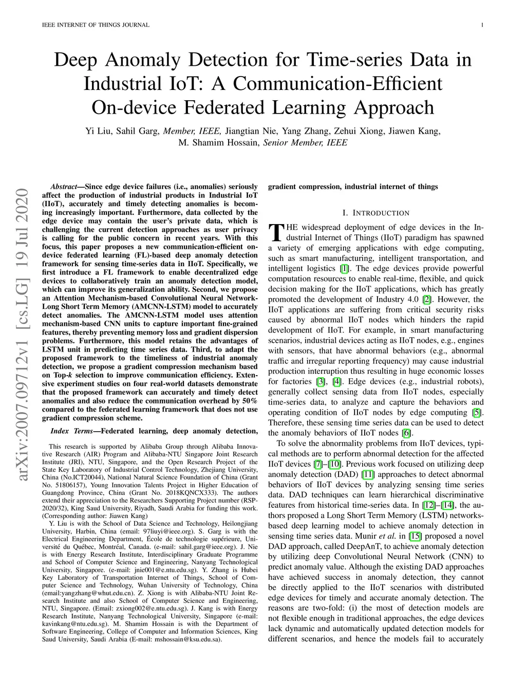 Since edge device failures (i.e., anomalies) seriously affect the production of industrial products in Industrial IoT (IIoT), accurately and timely detecting anomalies is becoming increasingly important. Furthermore, data collected by the edge device may contain the user's private data, which is challenging the current detection approaches as user privacy is calling for the public concern in recent years. With this focus, this paper proposes a new communication-efficient on-device federated learning (FL)-based deep anomaly detection framework for sensing time-series data in IIoT. Specifically, we first introduce a FL framework to enable decentralized edge devices to collaboratively train an anomaly detection model, which can improve its generalization ability. Second, we propose an Attention Mechanism-based Convolutional Neural Network-Long Short Term Memory (AMCNN-LSTM) model to accurately detect anomalies. The AMCNN-LSTM model uses attention mechanism-based CNN units to capture important fine-grained features, thereby preventing memory loss and gradient dispersion problems. Furthermore, this model retains the advantages of LSTM unit in predicting time series data. Third, to adapt the proposed framework to the timeliness of industrial anomaly detection, we propose a gradient compression mechanism based on Top-\textit{k} selection to improve communication efficiency. Extensive experiment studies on four real-world datasets demonstrate that the proposed framework can accurately and timely detect anomalies and also reduce the communication overhead by 50\% compared to the federated learning framework that does not use a gradient compression scheme.