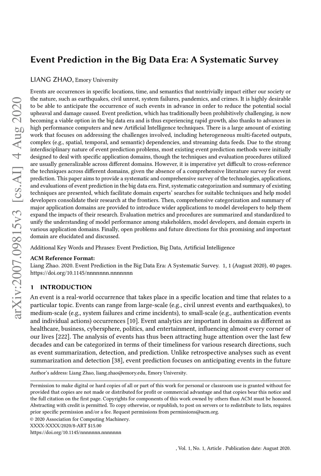 Events are occurrences in specific locations, time, and semantics that nontrivially impact either our society or the nature, such as civil unrest, system failures, and epidemics. It is highly desirable to be able to anticipate the occurrence of such events in advance in order to reduce the potential social upheaval and damage caused. Event prediction, which has traditionally been prohibitively challenging, is now becoming a viable option in the big data era and is thus experiencing rapid growth. There is a large amount of existing work that focuses on addressing the challenges involved, including heterogeneous multi-faceted outputs, complex dependencies, and streaming data feeds. Most existing event prediction methods were initially designed to deal with specific application domains, though the techniques and evaluation procedures utilized are usually generalizable across different domains. However, it is imperative yet difficult to cross-reference the techniques across different domains, given the absence of a comprehensive literature survey for event prediction. This paper aims to provide a systematic and comprehensive survey of the technologies, applications, and evaluations of event prediction in the big data era. First, systematic categorization and summary of existing techniques are presented, which facilitate domain experts' searches for suitable techniques and help model developers consolidate their research at the frontiers. Then, comprehensive categorization and summary of major application domains are provided. Evaluation metrics and procedures are summarized and standardized to unify the understanding of model performance among stakeholders, model developers, and domain experts in various application domains. Finally, open problems and future directions for this promising and important domain are elucidated and discussed.