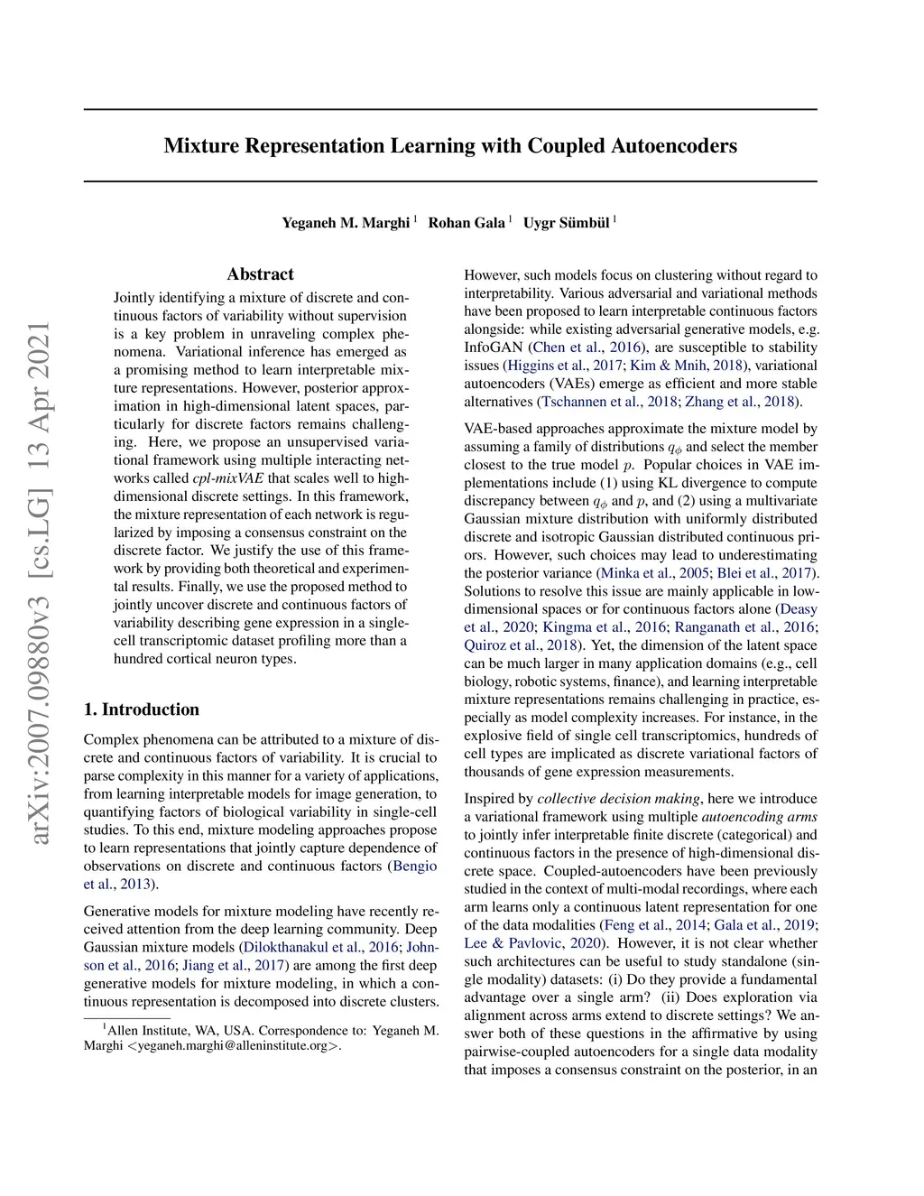 Jointly identifying a mixture of discrete and continuous factors of variability without supervision is a key problem in unraveling complex phenomena. Variational inference has emerged as a promising method to learn interpretable mixture representations. However, posterior approximation in high-dimensional latent spaces, particularly for discrete factors remains challenging. Here, we propose an unsupervised variational framework using multiple interacting networks called cpl-mixVAE that scales well to high-dimensional discrete settings. In this framework, the mixture representation of each network is regularized by imposing a consensus constraint on the discrete factor. We justify the use of this framework by providing both theoretical and experimental results. Finally, we use the proposed method to jointly uncover discrete and continuous factors of variability describing gene expression in a single-cell transcriptomic dataset profiling more than a hundred cortical neuron types.
