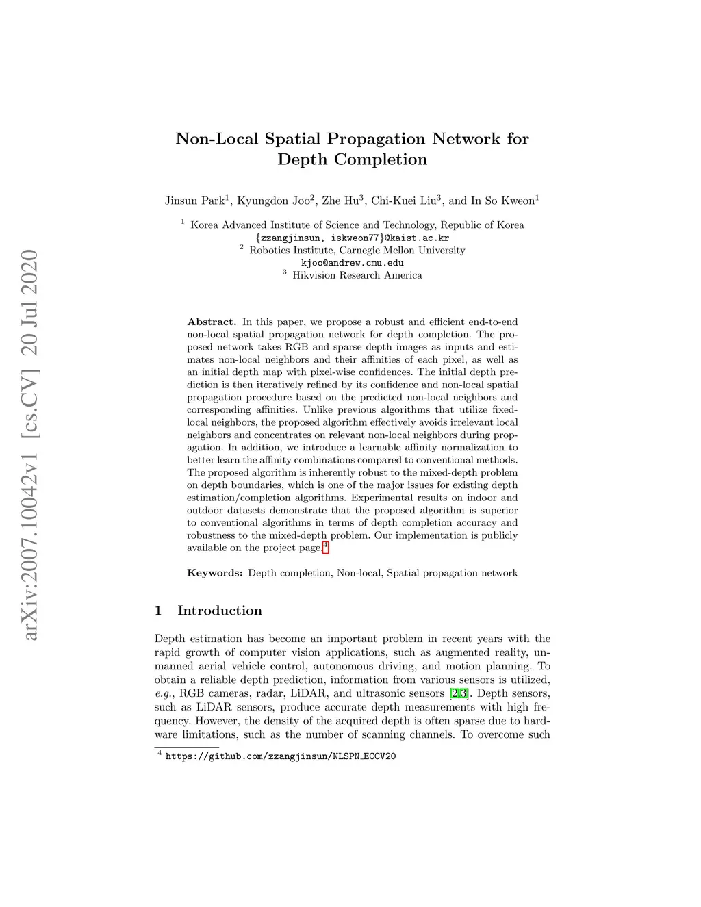 Non-Local Spatial Propagation Network for Depth Completion