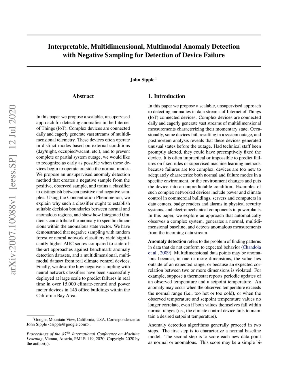 Complex devices are connected daily and eagerly generate vast streams of multidimensional state measurements. These devices often operate in distinct modes based on external conditions (day/night, occupied/vacant, etc.), and to prevent complete or partial system outage, we would like to recognize as early as possible when these devices begin to operate outside the normal modes. Unfortunately, it is often impractical or impossible to predict failures using rules or supervised machine learning, because failure modes are too complex, devices are too new to adequately characterize in a specific environment, or environmental change puts the device into an unpredictable condition. We propose an unsupervised anomaly detection method that creates a negative sample from the positive, observed sample, and trains a classifier to distinguish between positive and negative samples. Using the Contraction Principle, we explain why such a classifier ought to establish suitable decision boundaries between normal and anomalous regions, and show how Integrated Gradients can attribute the anomaly to specific variables within the anomalous state vector. We have demonstrated that negative sampling with random forest or neural network classifiers yield significantly higher AUC scores than Isolation Forest, One Class SVM, and Deep SVDD, against (a) a synthetic dataset with dimensionality ranging between 2 and 128, with 1, 2, and 3 modes, and with and without noise dimensions; (b) four standard benchmark datasets; and (c) a multidimensional, multimodal dataset from real climate control devices. Finally, we describe how negative sampling with neural network classifiers have been successfully deployed at large scale to predict failures in real time in over 15,000 climate-control and power meter devices in 145 Google office buildings.