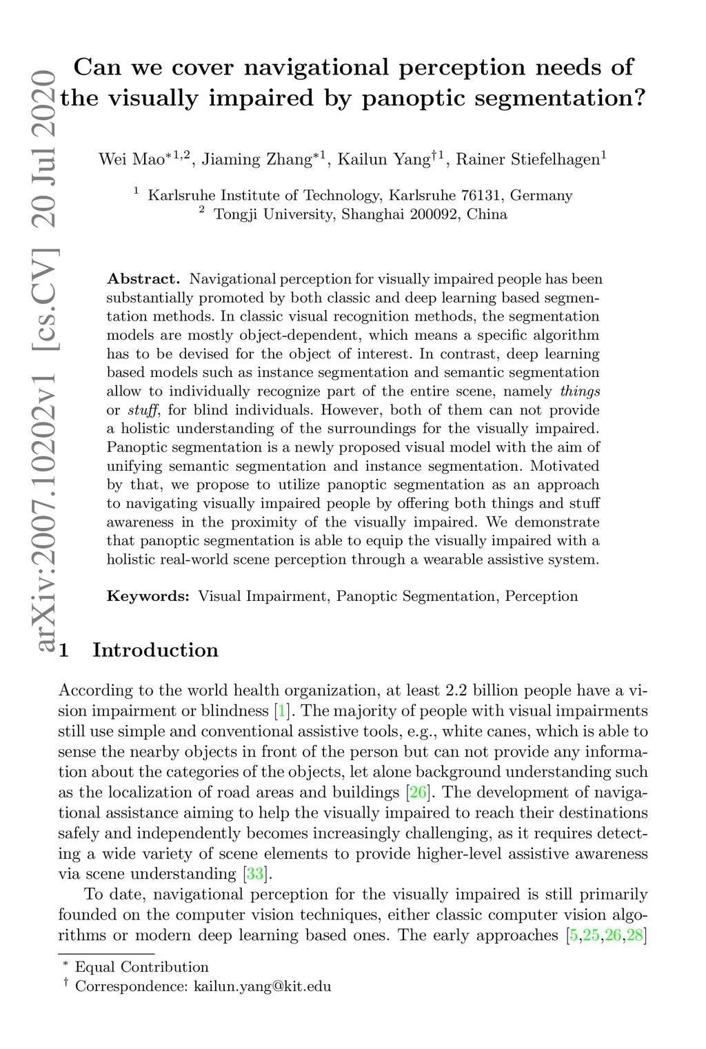 Navigational perception for visually impaired people has been substantially promoted by both classic and deep learning based segmentation methods. In classic visual recognition methods, the segmentation models are mostly object-dependent, which means a specific algorithm has to be devised for the object of interest. In contrast, deep learning based models such as instance segmentation and semantic segmentation allow to individually recognize part of the entire scene, namely things or stuff, for blind individuals. However, both of them can not provide a holistic understanding of the surroundings for the visually impaired. Panoptic segmentation is a newly proposed visual model with the aim of unifying semantic segmentation and instance segmentation. Motivated by that, we propose to utilize panoptic segmentation as an approach to navigating visually impaired people by offering both things and stuff awareness in the proximity of the visually impaired. We demonstrate that panoptic segmentation is able to equip the visually impaired with a holistic real-world scene perception through a wearable assistive system.