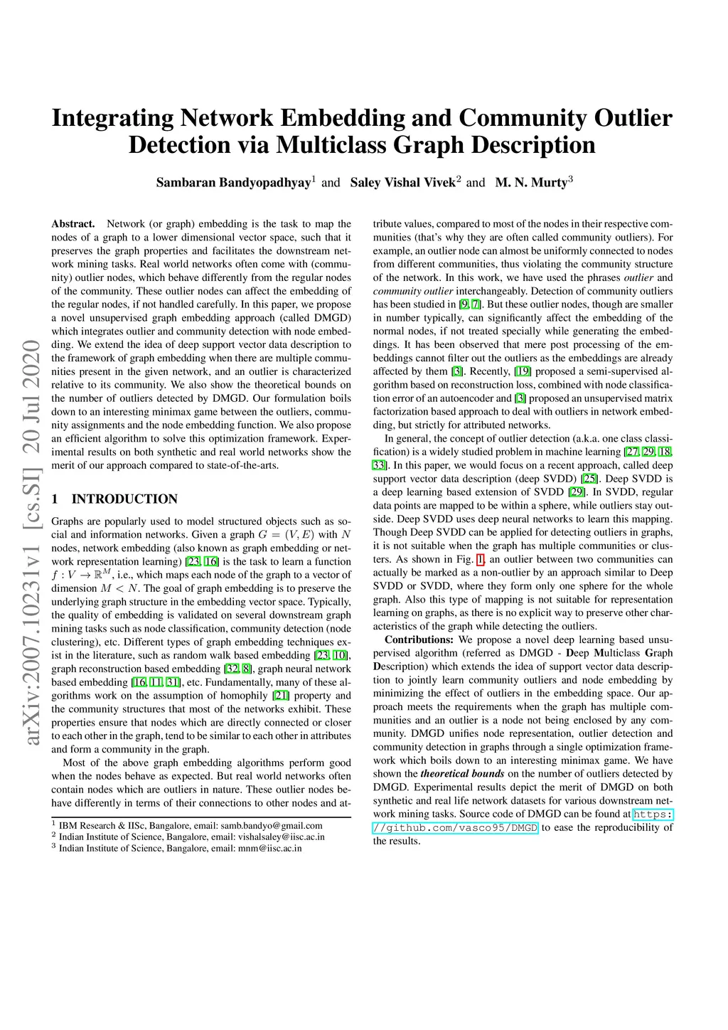 Network (or graph) embedding is the task to map the nodes of a graph to a lower dimensional vector space, such that it preserves the graph properties and facilitates the downstream network mining tasks. Real world networks often come with (community) outlier nodes, which behave differently from the regular nodes of the community. These outlier nodes can affect the embedding of the regular nodes, if not handled carefully. In this paper, we propose a novel unsupervised graph embedding approach (called DMGD) which integrates outlier and community detection with node embedding. We extend the idea of deep support vector data description to the framework of graph embedding when there are multiple communities present in the given network, and an outlier is characterized relative to its community. We also show the theoretical bounds on the number of outliers detected by DMGD. Our formulation boils down to an interesting minimax game between the outliers, community assignments and the node embedding function. We also propose an efficient algorithm to solve this optimization framework. Experimental results on both synthetic and real world networks show the merit of our approach compared to state-of-the-arts.