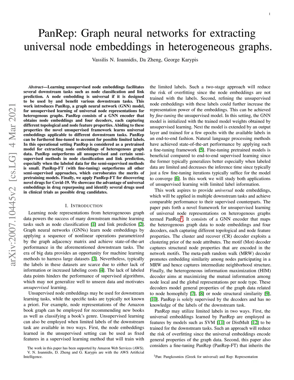 Learning unsupervised node embeddings facilitates several downstream tasks such as node classification and link prediction. A node embedding is universal if it is designed to be used by and benefit various downstream tasks. This work introduces PanRep, a graph neural network (GNN) model, for unsupervised learning of universal node representations for heterogenous graphs. PanRep consists of a GNN encoder that obtains node embeddings and four decoders, each capturing different topological and node feature properties. Abiding to these properties the novel unsupervised framework learns universal embeddings applicable to different downstream tasks. PanRep can be furthered fine-tuned to account for possible limited labels. In this operational setting PanRep is considered as a pretrained model for extracting node embeddings of heterogenous graph data. PanRep outperforms all unsupervised and certain supervised methods in node classification and link prediction, especially when the labeled data for the supervised methods is small. PanRep-FT (with fine-tuning) outperforms all other supervised approaches, which corroborates the merits of pretraining models. Finally, we apply PanRep-FT for discovering novel drugs for Covid-19. We showcase the advantage of universal embeddings in drug repurposing and identify several drugs used in clinical trials as possible drug candidates.
