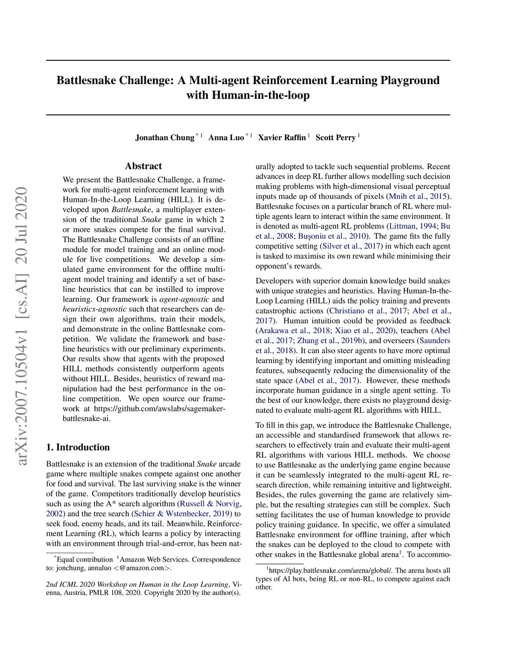 We present the Battlesnake Challenge, a framework for multi-agent reinforcement learning with Human-In-the-Loop Learning (HILL). It is developed upon Battlesnake, a multiplayer extension of the traditional Snake game in which 2 or more snakes compete for the final survival. The Battlesnake Challenge consists of an offline module for model training and an online module for live competitions. We develop a simulated game environment for the offline multi-agent model training and identify a set of baseline heuristics that can be instilled to improve learning. Our framework is agent-agnostic and heuristics-agnostic such that researchers can design their own algorithms, train their models, and demonstrate in the online Battlesnake competition. We validate the framework and baseline heuristics with our preliminary experiments. Our results show that agents with the proposed HILL methods consistently outperform agents without HILL. Besides, heuristics of reward manipulation had the best performance in the online competition. We open source our framework at https://github.com/awslabs/sagemaker-battlesnake-ai.