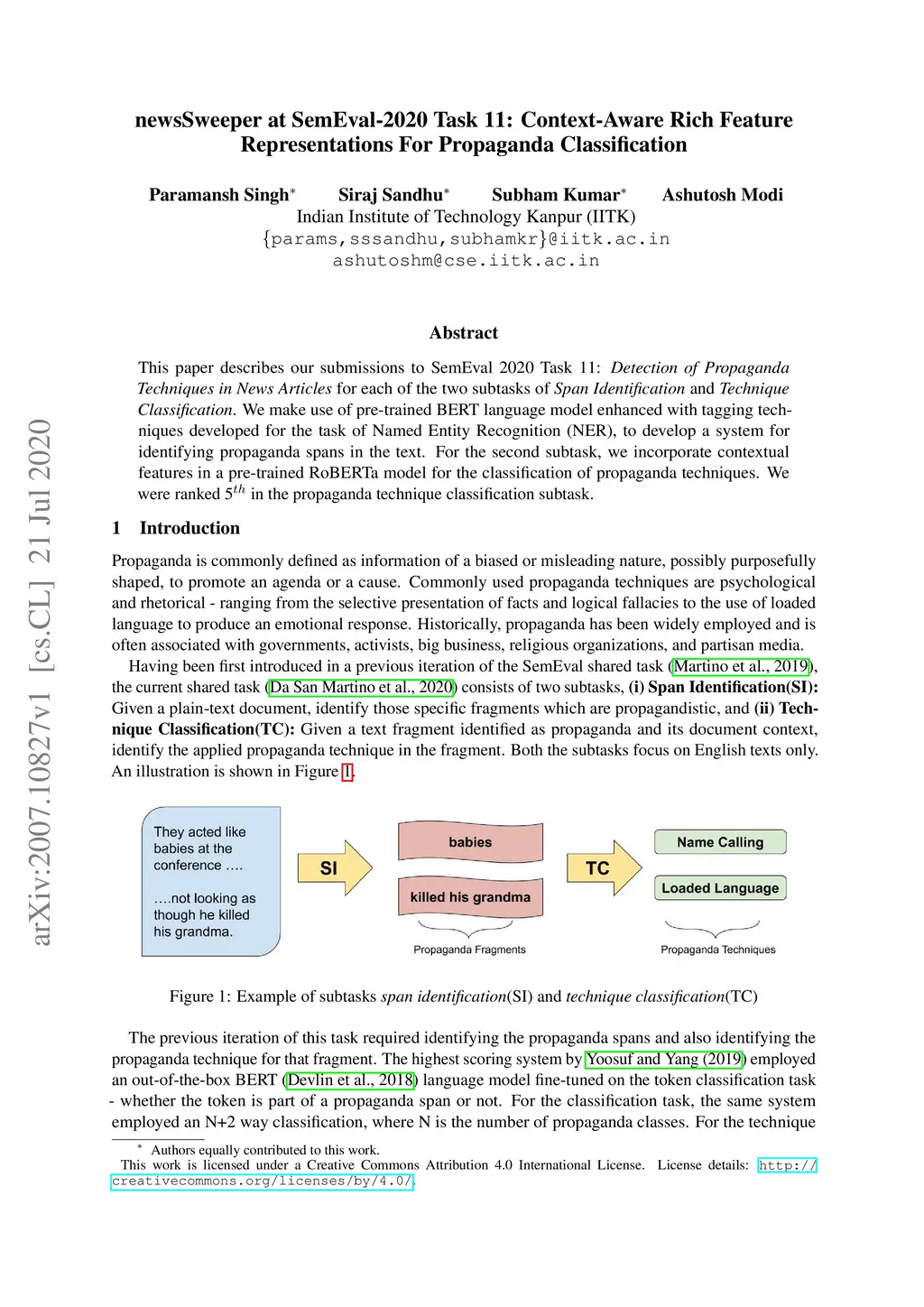 newsSweeper at SemEval-2020 Task 11: Context-Aware Rich Feature