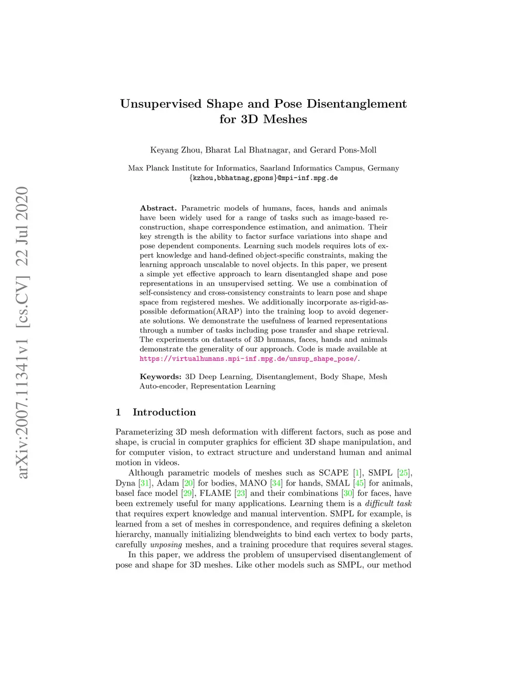 Unsupervised Shape and Pose Disentanglement for 3D Meshes