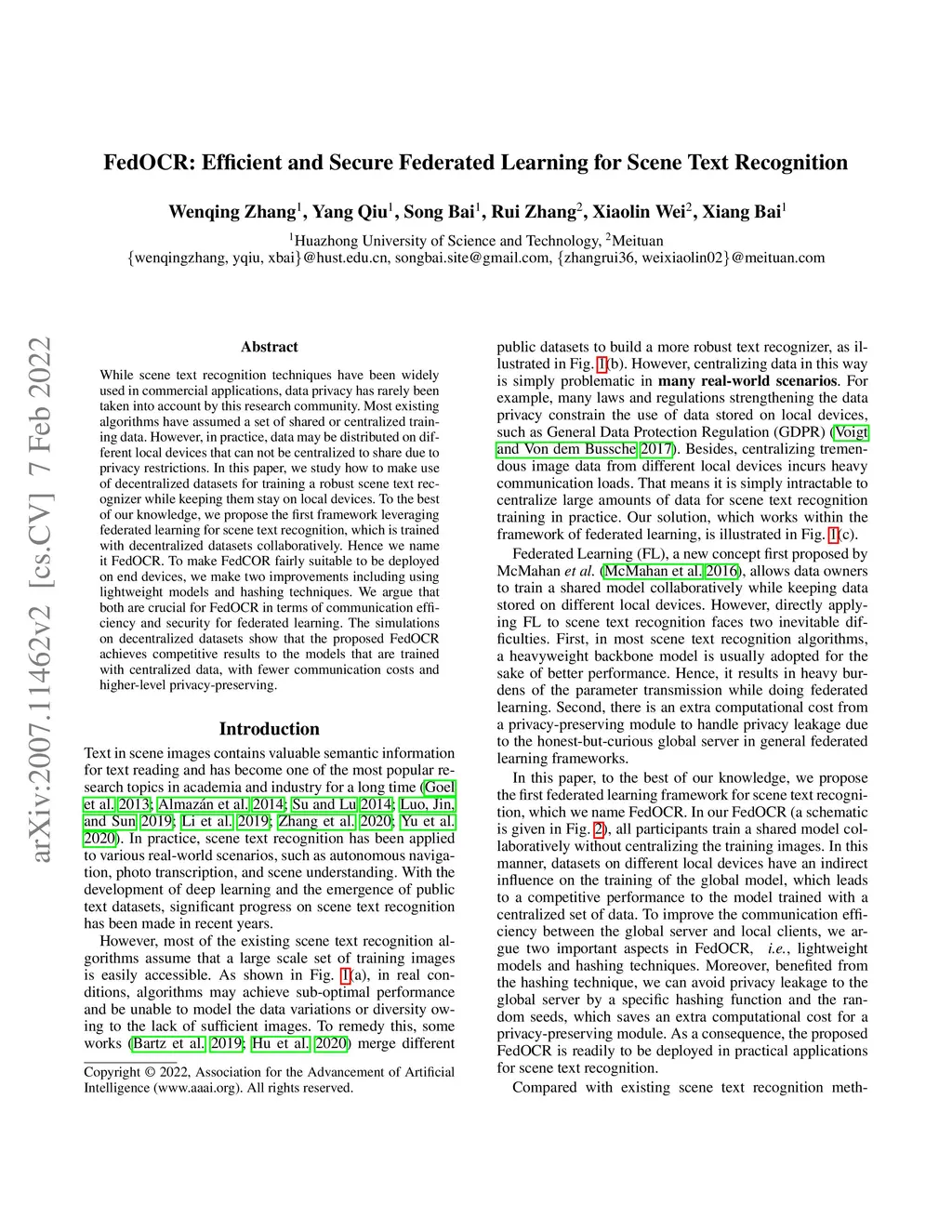 While scene text recognition techniques have been widely used in commercial applications, data privacy has rarely been taken into account by this research community. Most existing algorithms have assumed a set of shared or centralized training data. However, in practice, data may be distributed on different local devices that can not be centralized to share due to the privacy restrictions. In this paper, we study how to make use of decentralized datasets for training a robust scene text recognizer while keeping them stay on local devices. To the best of our knowledge, we propose the first framework leveraging federated learning for scene text recognition, which is trained with decentralized datasets collaboratively. Hence we name it FedOCR. To make FedCOR fairly suitable to be deployed on end devices, we make two improvements including using lightweight models and hashing techniques. We argue that both are crucial for FedOCR in terms of the communication efficiency of federated learning. The simulations on decentralized datasets show that the proposed FedOCR achieves competitive results to the models that are trained with centralized data, with fewer communication costs and higher-level privacy-preserving.