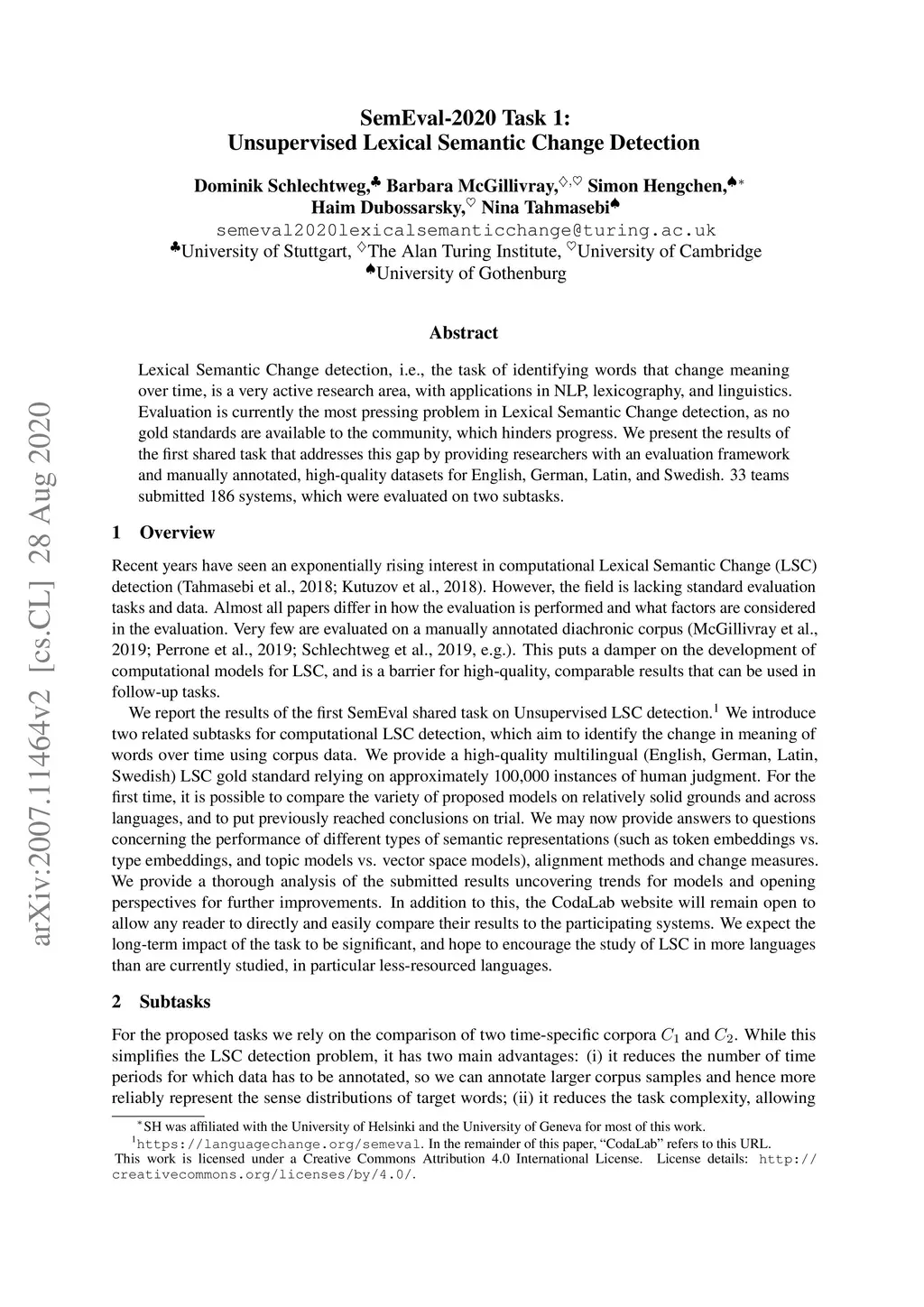 SemEval-2020 Task 1: Unsupervised Lexical Semantic Change Detection