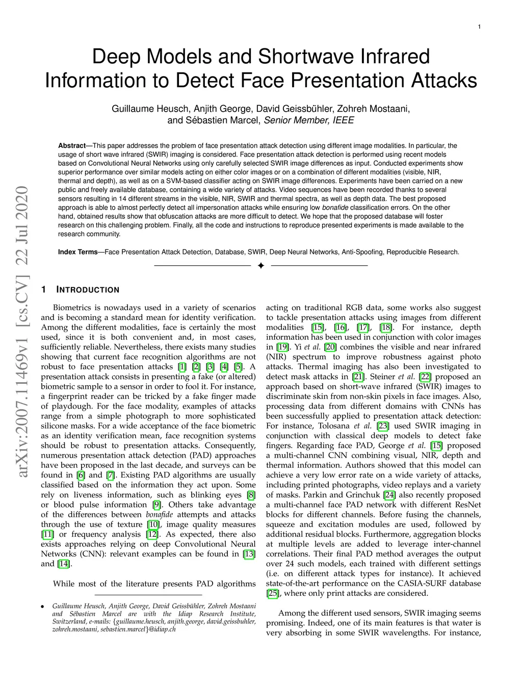Deep Models and Shortwave Infrared Information to Detect Face
