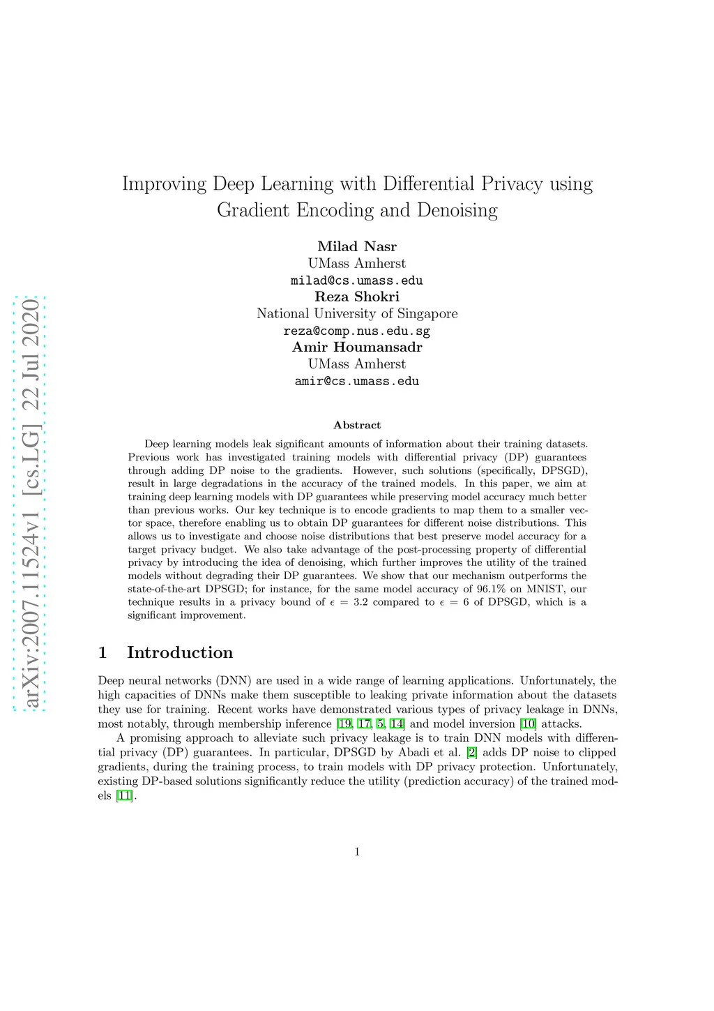 Deep learning models leak significant amounts of information about their training datasets. Previous work has investigated training models with differential privacy (DP) guarantees through adding DP noise to the gradients. However, such solutions (specifically, DPSGD), result in large degradations in the accuracy of the trained models. In this paper, we aim at training deep learning models with DP guarantees while preserving model accuracy much better than previous works. Our key technique is to encode gradients to map them to a smaller vector space, therefore enabling us to obtain DP guarantees for different noise distributions. This allows us to investigate and choose noise distributions that best preserve model accuracy for a target privacy budget. We also take advantage of the post-processing property of differential privacy by introducing the idea of denoising, which further improves the utility of the trained models without degrading their DP guarantees. We show that our mechanism outperforms the state-of-the-art DPSGD; for instance, for the same model accuracy of on MNIST, our technique results in a privacy bound of compared to of DPSGD, which is a significant improvement.