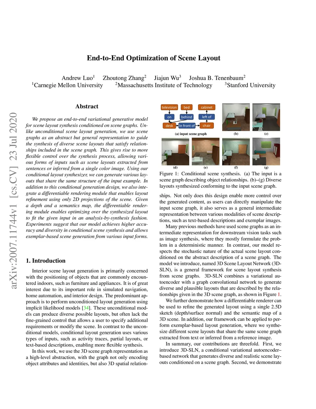 We propose an end-to-end variational generative model for scene layout synthesis conditioned on scene graphs. Unlike unconditional scene layout generation, we use scene graphs as an abstract but general representation to guide the synthesis of diverse scene layouts that satisfy relationships included in the scene graph. This gives rise to more flexible control over the synthesis process, allowing various forms of inputs such as scene layouts extracted from sentences or inferred from a single color image. Using our conditional layout synthesizer, we can generate various layouts that share the same structure of the input example. In addition to this conditional generation design, we also integrate a differentiable rendering module that enables layout refinement using only 2D projections of the scene. Given a depth and a semantics map, the differentiable rendering module enables optimizing over the synthesized layout to fit the given input in an analysis-by-synthesis fashion. Experiments suggest that our model achieves higher accuracy and diversity in conditional scene synthesis and allows exemplar-based scene generation from various input forms.