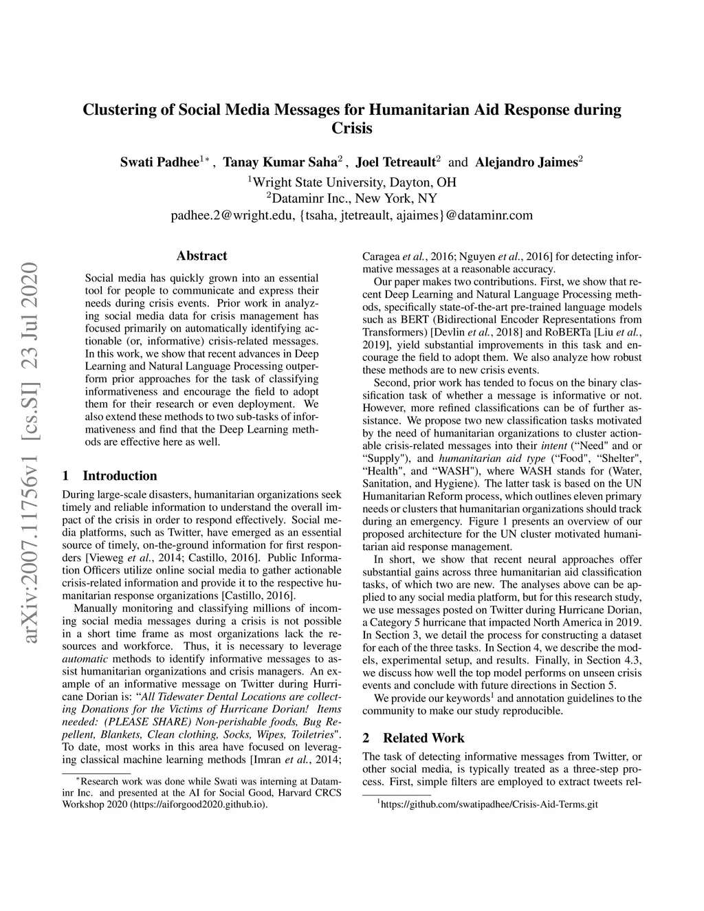 Clustering of Social Media Messages for Humanitarian Aid Response during