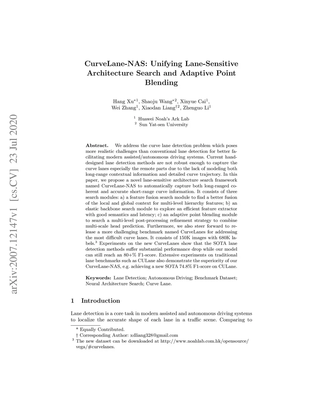 We address the curve lane detection problem which poses more realistic challenges than conventional lane detection for better facilitating modern assisted/autonomous driving systems. Current hand-designed lane detection methods are not robust enough to capture the curve lanes especially the remote parts due to the lack of modeling both long-range contextual information and detailed curve trajectory. In this paper, we propose a novel lane-sensitive architecture search framework named CurveLane-NAS to automatically capture both long-ranged coherent and accurate short-range curve information while unifying both architecture search and post-processing on curve lane predictions via point blending. It consists of three search modules: a) a feature fusion search module to find a better fusion of the local and global context for multi-level hierarchy features; b) an elastic backbone search module to explore an efficient feature extractor with good semantics and latency; c) an adaptive point blending module to search a multi-level post-processing refinement strategy to combine multi-scale head prediction. The unified framework ensures lane-sensitive predictions by the mutual guidance between NAS and adaptive point blending. Furthermore, we also steer forward to release a more challenging benchmark named CurveLanes for addressing the most difficult curve lanes. It consists of 150K images with 680K labels.The new dataset can be downloaded at github.com/xbjxh/CurveLanes (already anonymized for this submission). Experiments on the new CurveLanes show that the SOTA lane detection methods suffer substantial performance drop while our model can still reach an 80+% F1-score. Extensive experiments on traditional lane benchmarks such as CULane also demonstrate the superiority of our CurveLane-NAS, e.g. achieving a new SOTA 74.8% F1-score on CULane.