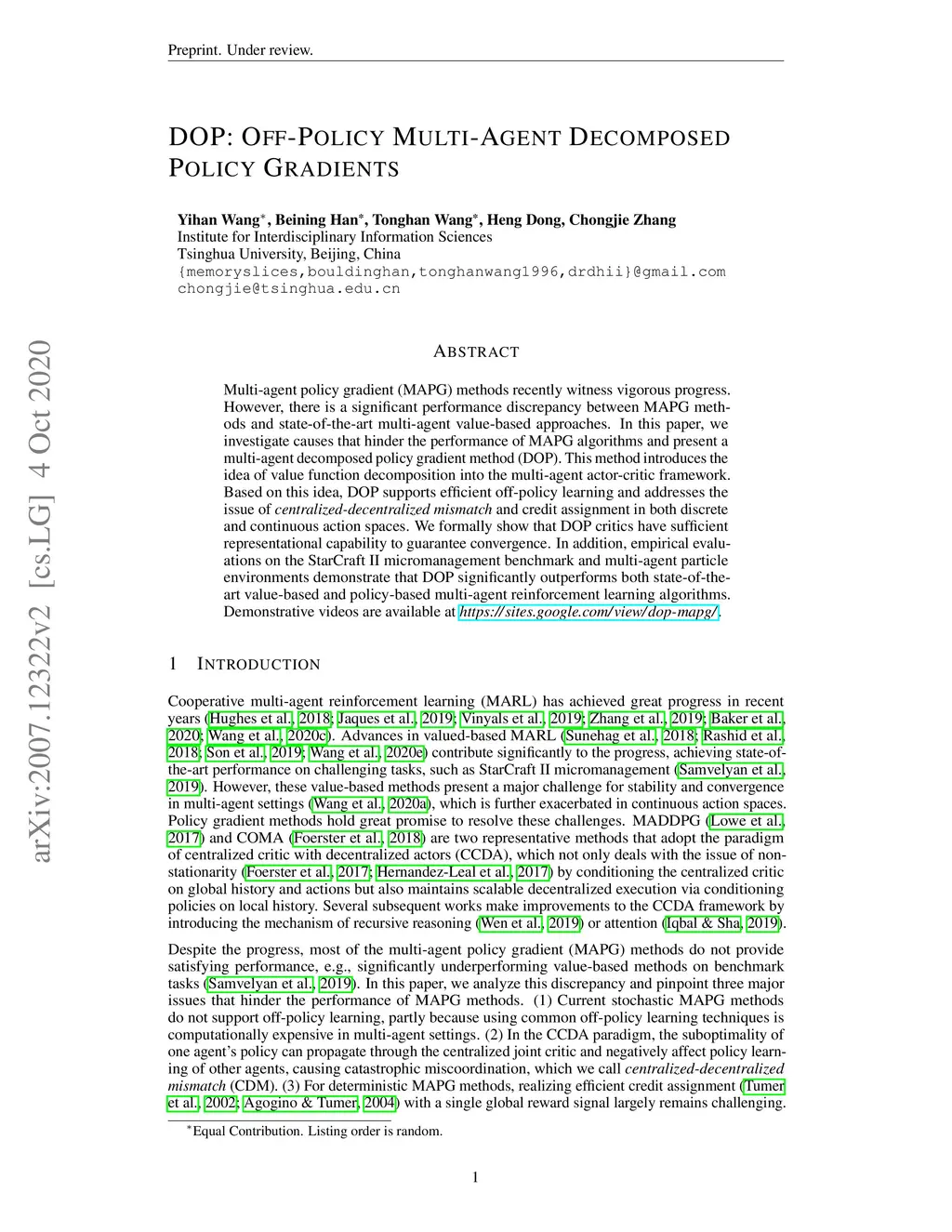 Multi-agent policy gradient (MAPG) methods recently witness vigorous progress. However, there is a significant performance discrepancy between MAPG methods and state-of-the-art multi-agent value-based approaches. In this paper, we investigate causes that hinder the performance of MAPG algorithms and present a multi-agent decomposed policy gradient method (DOP). This method introduces the idea of value function decomposition into the multi-agent actor-critic framework. Based on this idea, DOP supports efficient off-policy learning and addresses the issue of centralized-decentralized mismatch and credit assignment in both discrete and continuous action spaces. We formally show that DOP critics have sufficient representational capability to guarantee convergence. In addition, empirical evaluations on the StarCraft II micromanagement benchmark and multi-agent particle environments demonstrate that DOP significantly outperforms both state-of-the-art value-based and policy-based multi-agent reinforcement learning algorithms. Demonstrative videos are available at https://sites.google.com/view/dop-mapg/.