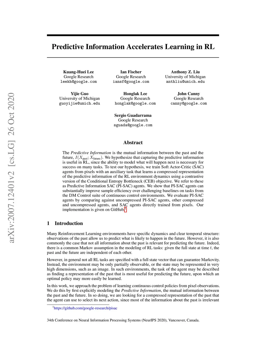 The Predictive Information is the mutual information between the past and the future, I(X_past; X_future). We hypothesize that capturing the predictive information is useful in RL, since the ability to model what will happen next is necessary for success on many tasks. To test our hypothesis, we train Soft Actor-Critic (SAC) agents from pixels with an auxiliary task that learns a compressed representation of the predictive information of the RL environment dynamics using a contrastive version of the Conditional Entropy Bottleneck (CEB) objective. We refer to these as Predictive Information SAC (PI-SAC) agents. We show that PI-SAC agents can substantially improve sample efficiency over challenging baselines on tasks from the DM Control suite of continuous control environments. We evaluate PI-SAC agents by comparing against uncompressed PI-SAC agents, other compressed and uncompressed agents, and SAC agents directly trained from pixels. Our implementation is given on GitHub.