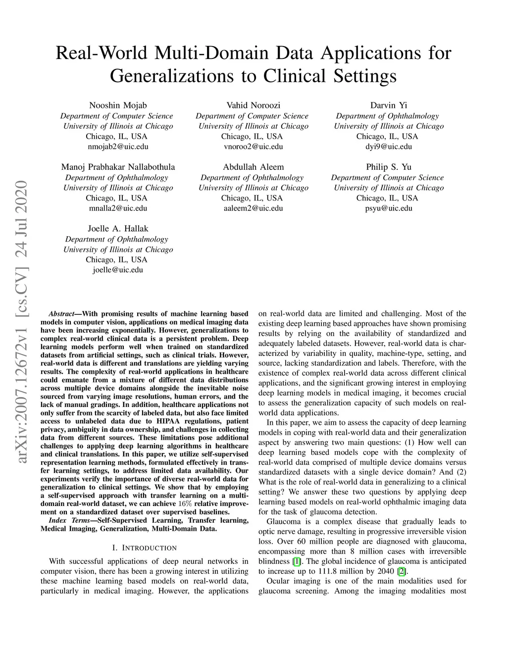With promising results of machine learning based models in computer vision, applications on medical imaging data have been increasing exponentially. However, generalizations to complex real-world clinical data is a persistent problem. Deep learning models perform well when trained on standardized datasets from artificial settings, such as clinical trials. However, real-world data is different and translations are yielding varying results. The complexity of real-world applications in healthcare could emanate from a mixture of different data distributions across multiple device domains alongside the inevitable noise sourced from varying image resolutions, human errors, and the lack of manual gradings. In addition, healthcare applications not only suffer from the scarcity of labeled data, but also face limited access to unlabeled data due to HIPAA regulations, patient privacy, ambiguity in data ownership, and challenges in collecting data from different sources. These limitations pose additional challenges to applying deep learning algorithms in healthcare and clinical translations. In this paper, we utilize self-supervised representation learning methods, formulated effectively in transfer learning settings, to address limited data availability. Our experiments verify the importance of diverse real-world data for generalization to clinical settings. We show that by employing a self-supervised approach with transfer learning on a multi-domain real-world dataset, we can achieve 16% relative improvement on a standardized dataset over supervised baselines.