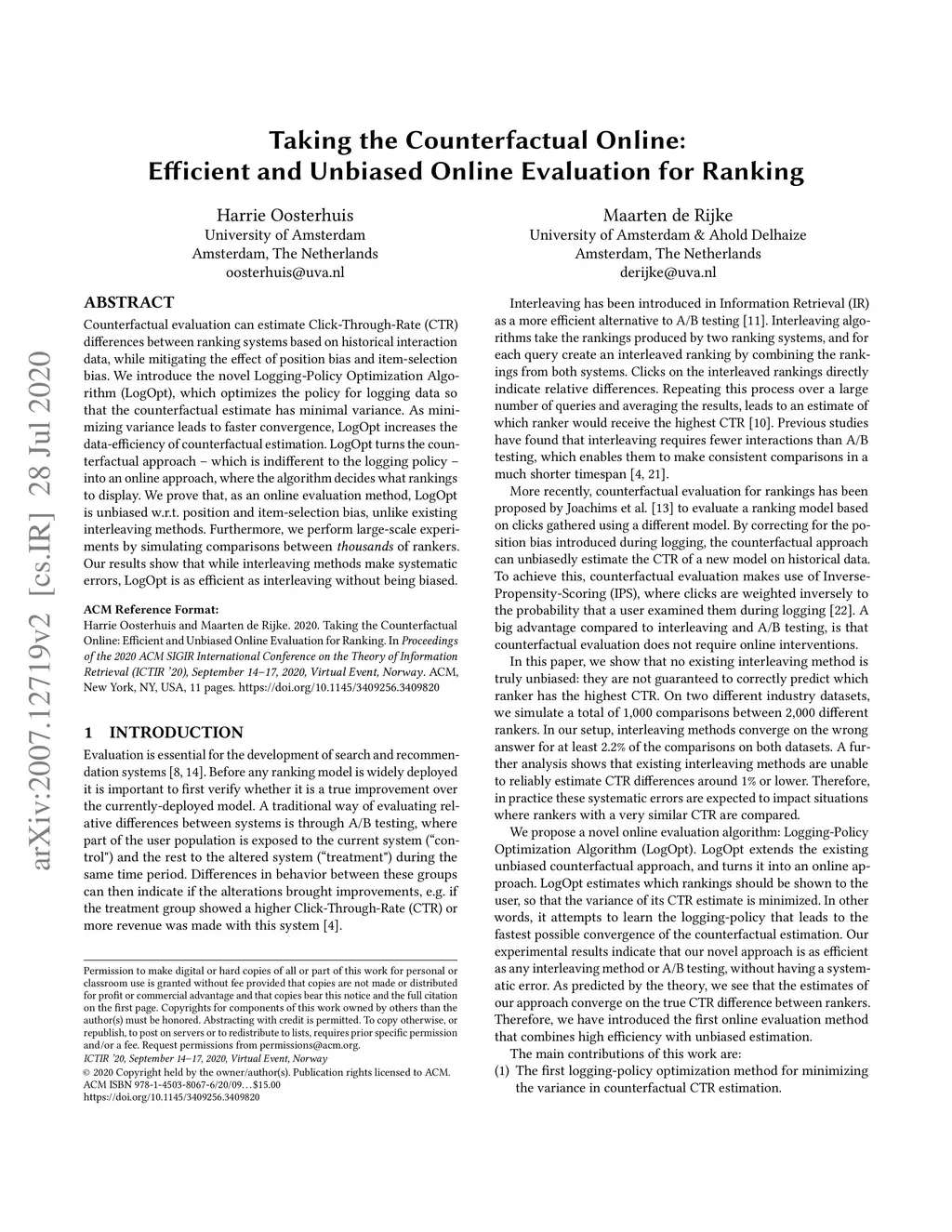 Counterfactual evaluation can estimate Click-Through-Rate (CTR) differences between ranking systems based on historical interaction data, while mitigating the effect of position bias and item-selection bias. We introduce the novel Logging-Policy Optimization Algorithm (LogOpt), which optimizes the policy for logging data so that the counterfactual estimate has minimal variance. As minimizing variance leads to faster convergence, LogOpt increases the data-efficiency of counterfactual estimation. LogOpt turns the counterfactual approach - which is indifferent to the logging policy - into an online approach, where the algorithm decides what rankings to display. We prove that, as an online evaluation method, LogOpt is unbiased w.r.t. position and item-selection bias, unlike existing interleaving methods. Furthermore, we perform large-scale experiments by simulating comparisons between thousands of rankers. Our results show that while interleaving methods make systematic errors, LogOpt is as efficient as interleaving without being biased.