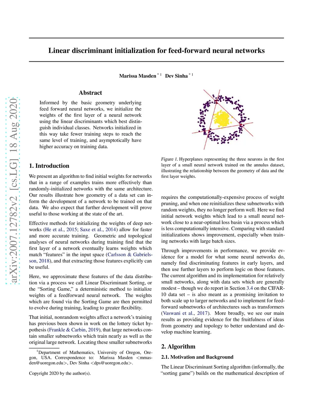 Informed by the basic geometry underlying feed forward neural networks, we initialize the weights of the first layer of a neural network using the linear discriminants which best distinguish individual classes. Networks initialized in this way take fewer training steps to reach the same level of training, and asymptotically have higher accuracy on training data.