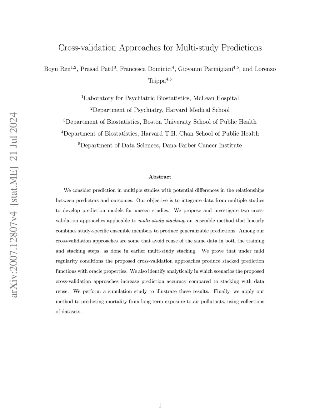 The integration and use of data from multiple studies, for the development of prediction models is an important task in several scientific fields. We propose a framework for generalist and specialist predictions that leverages multiple datasets, with potential differences in the relationships between predictors and outcomes. Our framework uses stacking, and it includes three major components: 1) an ensemble of prediction models trained on one or more datasets, 2) task-specific utility functions and 3) a no-data-reuse technique for estimating stacking weights. We illustrate that under mild regularity conditions the framework produces stacked PFs with oracle properties. In particular we show that the the stacking weights are nearly optimal. We also characterize the scenario where the proposed no-data-reuse technique increases prediction accuracy compared to stacking with data reuse in a special case.We perform a simulation study to illustrate these results. We apply our framework to predict mortality using a collection of datasets on long-term exposure to air pollutants.
