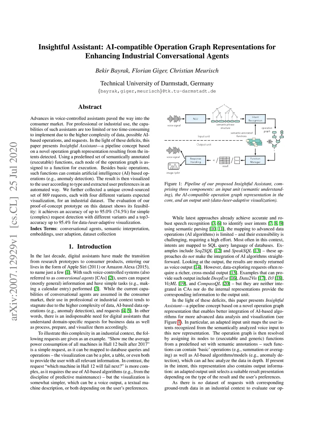 Advances in voice-controlled assistants paved the way into the consumer market. For professional or industrial use, the capabilities of such assistants are too limited or too time-consuming to implement due to the higher complexity of data, possible AI-based operations, and requests. In the light of these deficits, this paper presents Insightful Assistant---a pipeline concept based on a novel operation graph representation resulting from the intents detected. Using a predefined set of semantically annotated (executable) functions, each node of the operation graph is assigned to a function for execution. Besides basic operations, such functions can contain artificial intelligence (AI) based operations (e.g., anomaly detection). The result is then visualized to the user according to type and extracted user preferences in an automated way. We further collected a unique crowd-sourced set of 869 requests, each with four different variants expected visualization, for an industrial dataset. The evaluation of our proof-of-concept prototype on this dataset shows its feasibility: it achieves an accuracy of up to 95.0% (74.5%) for simple (complex) request detection with different variants and a top3-accuracy up to 95.4% for data-/user-adaptive visualization.