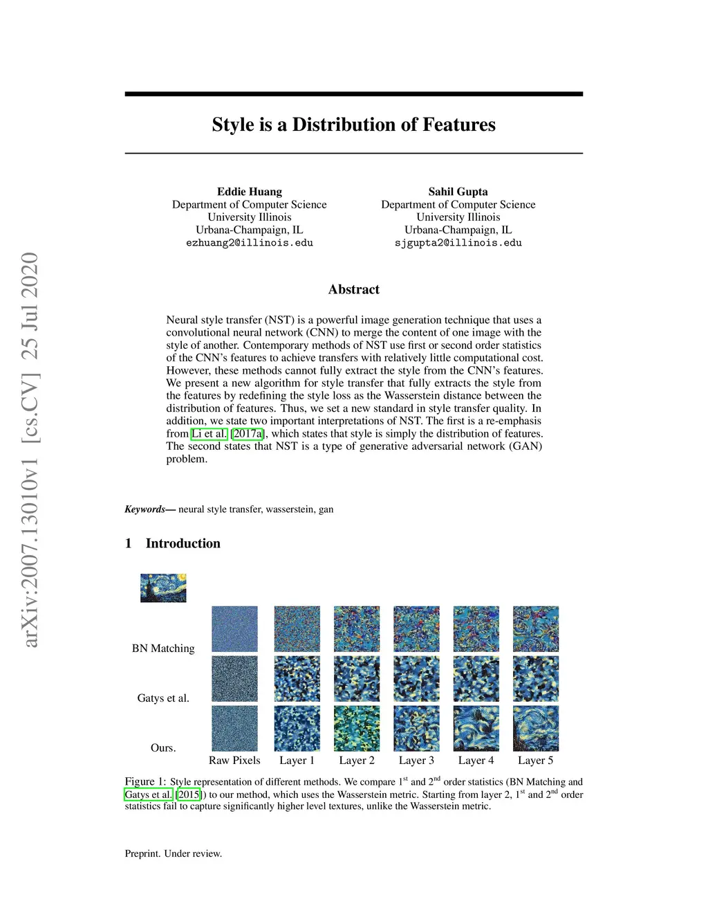 Neural style transfer (NST) is a powerful image generation technique that uses a convolutional neural network (CNN) to merge the content of one image with the style of another. Contemporary methods of NST use first or second order statistics of the CNN's features to achieve transfers with relatively little computational cost. However, these methods cannot fully extract the style from the CNN's features. We present a new algorithm for style transfer that fully extracts the style from the features by redefining the style loss as the Wasserstein distance between the distribution of features. Thus, we set a new standard in style transfer quality. In addition, we state two important interpretations of NST. The first is a re-emphasis from Li et al., which states that style is simply the distribution of features. The second states that NST is a type of generative adversarial network (GAN) problem.