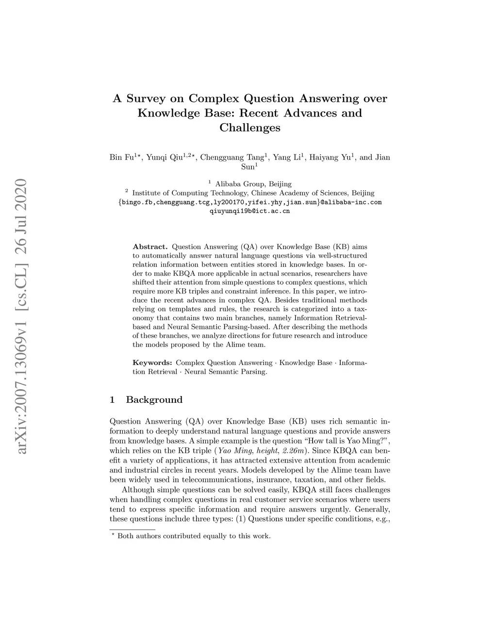 Question Answering (QA) over Knowledge Base (KB) aims to automatically answer natural language questions via well-structured relation information between entities stored in knowledge bases. In order to make KBQA more applicable in actual scenarios, researchers have shifted their attention from simple questions to complex questions, which require more KB triples and constraint inference. In this paper, we introduce the recent advances in complex QA. Besides traditional methods relying on templates and rules, the research is categorized into a taxonomy that contains two main branches, namely Information Retrieval-based and Neural Semantic Parsing-based. After describing the methods of these branches, we analyze directions for future research and introduce the models proposed by the Alime team.