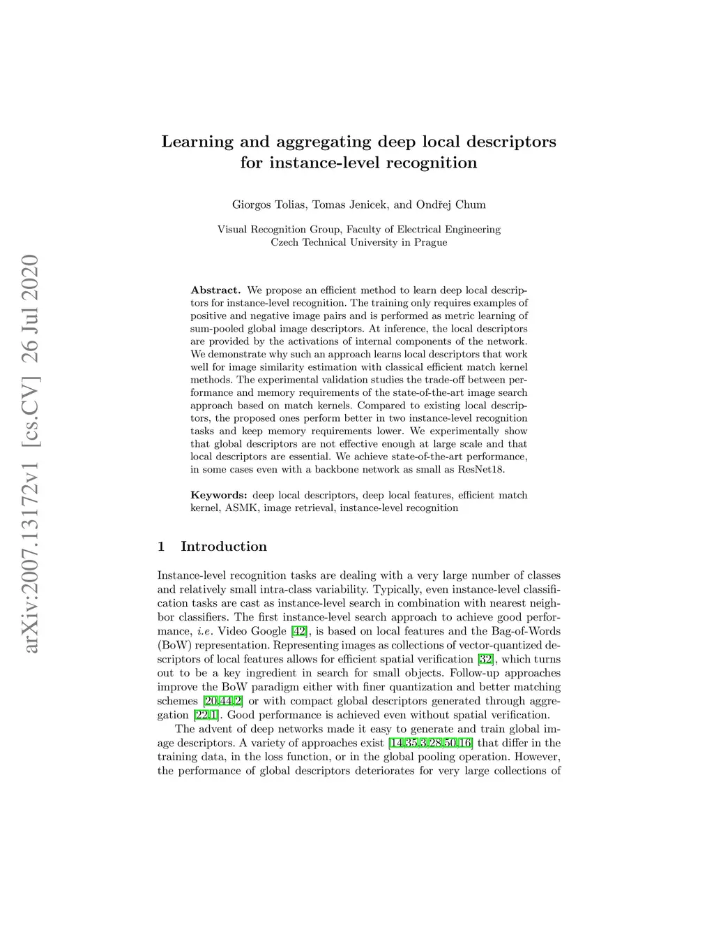 We propose an efficient method to learn deep local descriptors for instance-level recognition. The training only requires examples of positive and negative image pairs and is performed as metric learning of sum-pooled global image descriptors. At inference, the local descriptors are provided by the activations of internal components of the network. We demonstrate why such an approach learns local descriptors that work well for image similarity estimation with classical efficient match kernel methods. The experimental validation studies the trade-off between performance and memory requirements of the state-of-the-art image search approach based on match kernels. Compared to existing local descriptors, the proposed ones perform better in two instance-level recognition tasks and keep memory requirements lower. We experimentally show that global descriptors are not effective enough at large scale and that local descriptors are essential. We achieve state-of-the-art performance, in some cases even with a backbone network as small as ResNet18.
