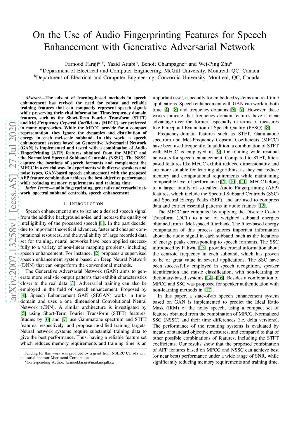The advent of learning-based methods in speech enhancement has revived the need for robust and reliable training features that can compactly represent speech signals while preserving their vital information. Time-frequency domain features, such as the Short-Term Fourier Transform (STFT) and Mel-Frequency Cepstral Coefficients (MFCC), are preferred in many approaches. While the MFCC provide for a compact representation, they ignore the dynamics and distribution of energy in each mel-scale subband. In this work, a speech enhancement system based on Generative Adversarial Network (GAN) is implemented and tested with a combination of Audio FingerPrinting (AFP) features obtained from the MFCC and the Normalized Spectral Subband Centroids (NSSC). The NSSC capture the locations of speech formants and complement the MFCC in a crucial way. In experiments with diverse speakers and noise types, GAN-based speech enhancement with the proposed AFP feature combination achieves the best objective performance while reducing memory requirements and training time.