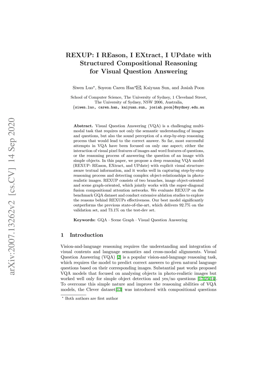 Visual question answering (VQA) is a challenging multi-modal task that requires not only the semantic understanding of both images and questions, but also the sound perception of a step-by-step reasoning process that would lead to the correct answer. So far, most successful attempts in VQA have been focused on only one aspect, either the interaction of visual pixel features of images and word features of questions, or the reasoning process of answering the question in an image with simple objects. In this paper, we propose a deep reasoning VQA model with explicit visual structure-aware textual information, and it works well in capturing step-by-step reasoning process and detecting a complex object-relationship in photo-realistic images. REXUP network consists of two branches, image object-oriented and scene graph oriented, which jointly works with super-diagonal fusion compositional attention network. We quantitatively and qualitatively evaluate REXUP on the GQA dataset and conduct extensive ablation studies to explore the reasons behind REXUP's effectiveness. Our best model significantly outperforms the precious state-of-the-art, which delivers 92.7% on the validation set and 73.1% on the test-dev set.