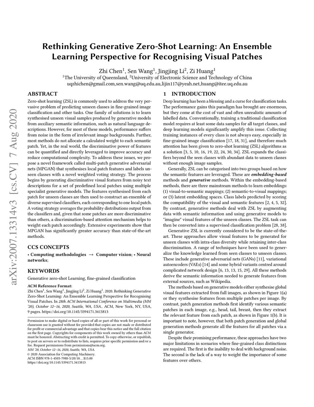 Zero-shot learning (ZSL) is commonly used to address the very pervasive problem of predicting unseen classes in fine-grained image classification and other tasks. One family of solutions is to learn synthesised unseen visual samples produced by generative models from auxiliary semantic information, such as natural language descriptions. However, for most of these models, performance suffers from noise in the form of irrelevant image backgrounds. Further, most methods do not allocate a calculated weight to each semantic patch. Yet, in the real world, the discriminative power of features can be quantified and directly leveraged to improve accuracy and reduce computational complexity. To address these issues, we propose a novel framework called multi-patch generative adversarial nets (MPGAN) that synthesises local patch features and labels unseen classes with a novel weighted voting strategy. The process begins by generating discriminative visual features from noisy text descriptions for a set of predefined local patches using multiple specialist generative models. The features synthesised from each patch for unseen classes are then used to construct an ensemble of diverse supervised classifiers, each corresponding to one local patch. A voting strategy averages the probability distributions output from the classifiers and, given that some patches are more discriminative than others, a discrimination-based attention mechanism helps to weight each patch accordingly. Extensive experiments show that MPGAN has significantly greater accuracy than state-of-the-art methods.