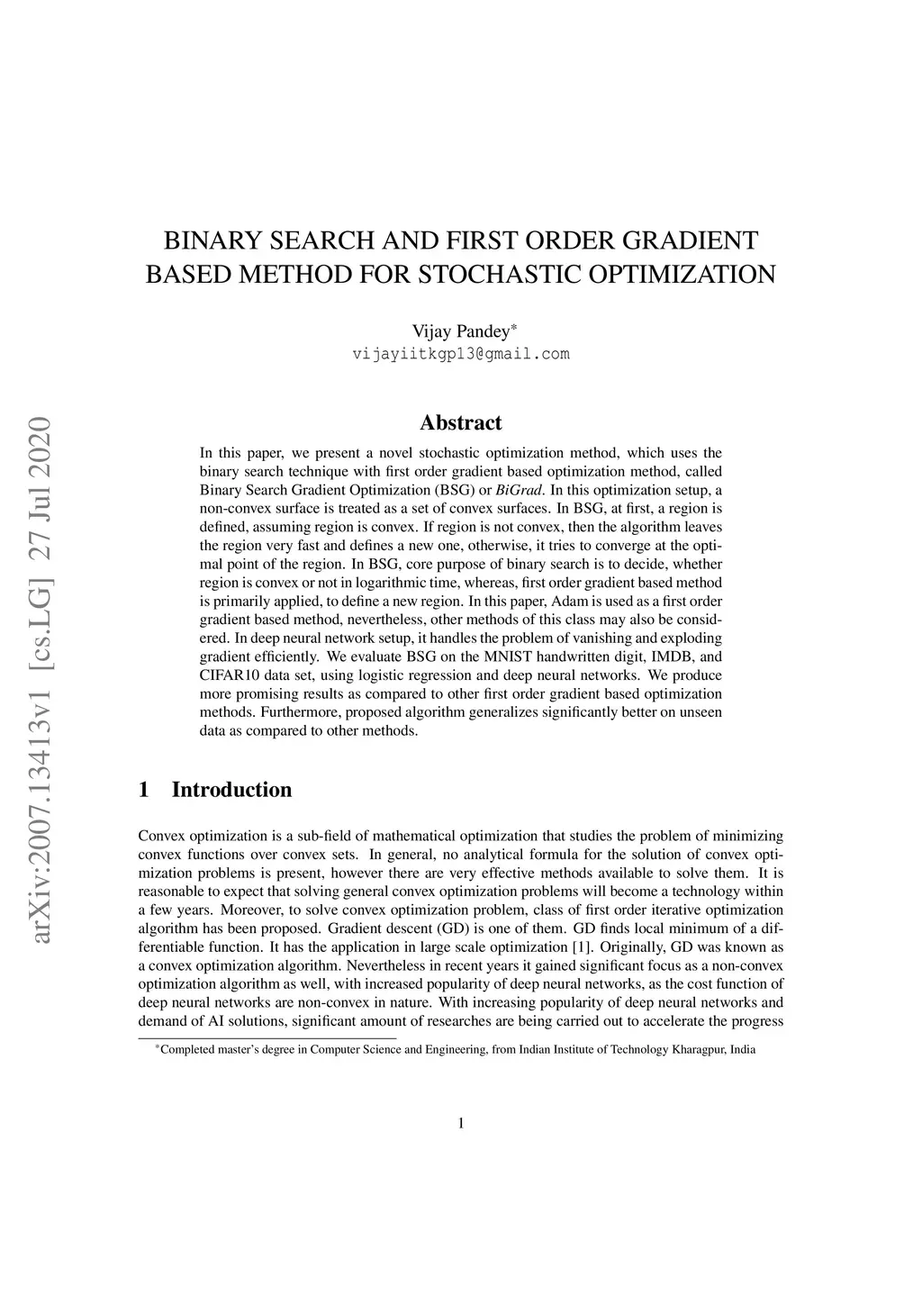 In this paper, we present a novel stochastic optimization method, which uses the binary search technique with first order gradient based optimization method, called Binary Search Gradient Optimization (BSG) or BiGrad. In this optimization setup, a non-convex surface is treated as a set of convex surfaces. In BSG, at first, a region is defined, assuming region is convex. If region is not convex, then the algorithm leaves the region very fast and defines a new one, otherwise, it tries to converge at the optimal point of the region. In BSG, core purpose of binary search is to decide, whether region is convex or not in logarithmic time, whereas, first order gradient based method is primarily applied, to define a new region. In this paper, Adam is used as a first order gradient based method, nevertheless, other methods of this class may also be considered. In deep neural network setup, it handles the problem of vanishing and exploding gradient efficiently. We evaluate BSG on the MNIST handwritten digit, IMDB, and CIFAR10 data set, using logistic regression and deep neural networks. We produce more promising results as compared to other first order gradient based optimization methods. Furthermore, proposed algorithm generalizes significantly better on unseen data as compared to other methods.