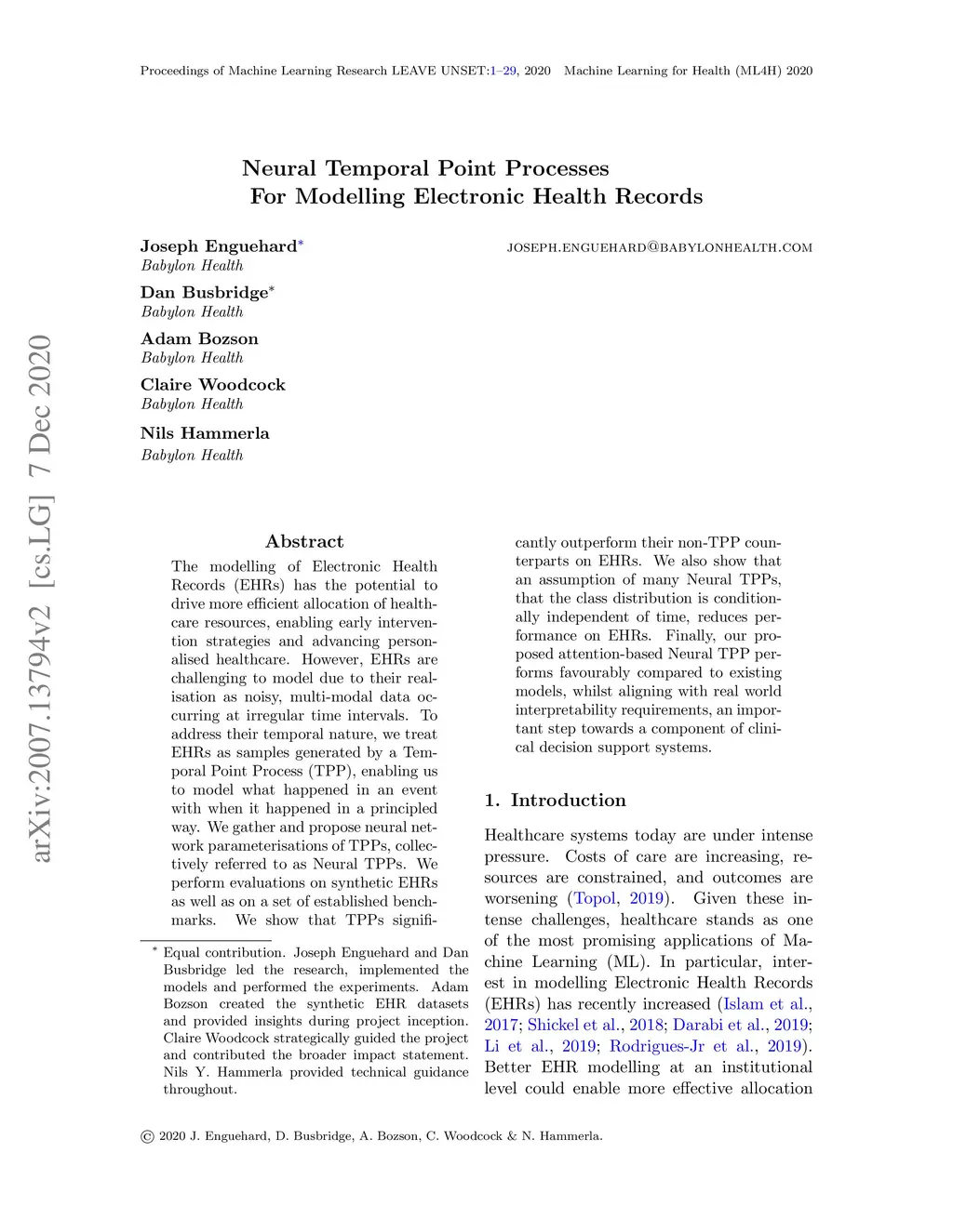 Neural Temporal Point Processes For Modelling Electronic Health Records