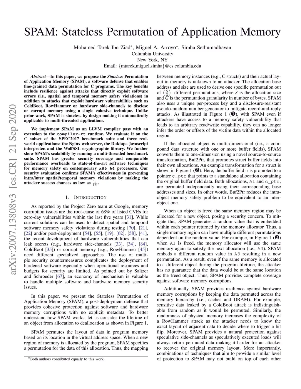 In this paper, we propose the Stateless Permutation of Application Memory (SPAM), a software defense that enables fine-grained data permutation for C programs. The key benefits include resilience against attacks that directly exploit software errors (i.e., spatial and temporal memory safety violations) in addition to attacks that exploit hardware vulnerabilities such as ColdBoot, RowHammer or hardware side-channels to disclose or corrupt memory using a single cohesive technique. Unlike prior work, SPAM is stateless by design making it automatically applicable to multi-threaded applications. We implement SPAM as an LLVM compiler pass with an extension to the compiler-rt runtime. We evaluate it on the C subset of the SPEC2017 benchmark suite and three real-world applications: the Nginx web server, the Duktape Javascript interpreter, and the WolfSSL cryptographic library. We further show SPAM's scalability by running a multi-threaded benchmark suite. SPAM has greater security coverage and comparable performance overheads to state-of-the-art software techniques for memory safety on contemporary x86_64 processors. Our security evaluation confirms SPAM's effectiveness in preventing intra/inter spatial/temporal memory violations by making the attacker success chances as low as 1/16!.
