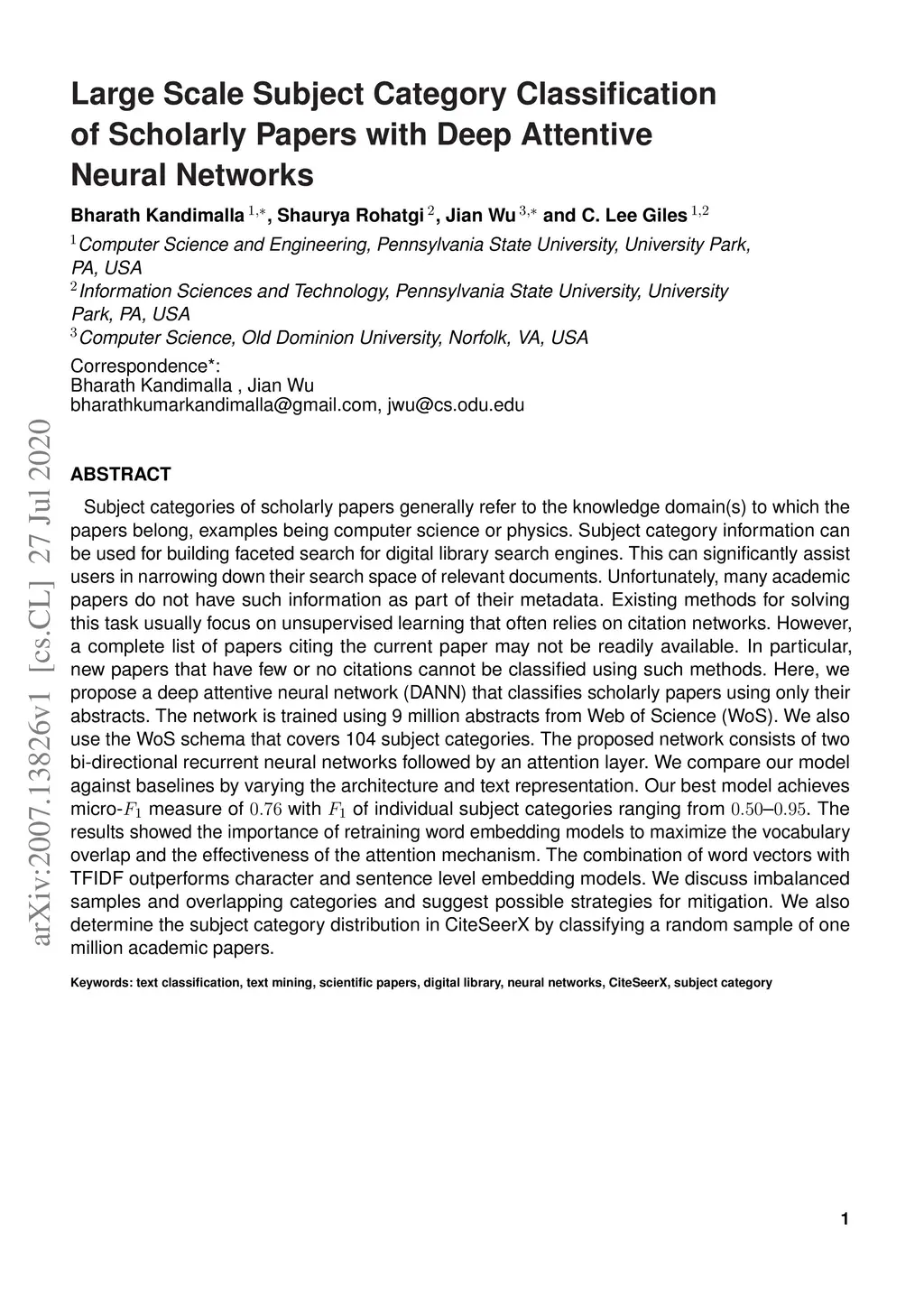 Subject categories of scholarly papers generally refer to the knowledge domain(s) to which the papers belong, examples being computer science or physics. Subject category information can be used for building faceted search for digital library search engines. This can significantly assist users in narrowing down their search space of relevant documents. Unfortunately, many academic papers do not have such information as part of their metadata. Existing methods for solving this task usually focus on unsupervised learning that often relies on citation networks. However, a complete list of papers citing the current paper may not be readily available. In particular, new papers that have few or no citations cannot be classified using such methods. Here, we propose a deep attentive neural network (DANN) that classifies scholarly papers using only their abstracts. The network is trained using 9 million abstracts from Web of Science (WoS). We also use the WoS schema that covers 104 subject categories. The proposed network consists of two bi-directional recurrent neural networks followed by an attention layer. We compare our model against baselines by varying the architecture and text representation. Our best model achieves micro-F1 measure of 0.76 with F1 of individual subject categories ranging from 0.50-0.95. The results showed the importance of retraining word embedding models to maximize the vocabulary overlap and the effectiveness of the attention mechanism. The combination of word vectors with TFIDF outperforms character and sentence level embedding models. We discuss imbalanced samples and overlapping categories and suggest possible strategies for mitigation. We also determine the subject category distribution in CiteSeerX by classifying a random sample of one million academic papers.
