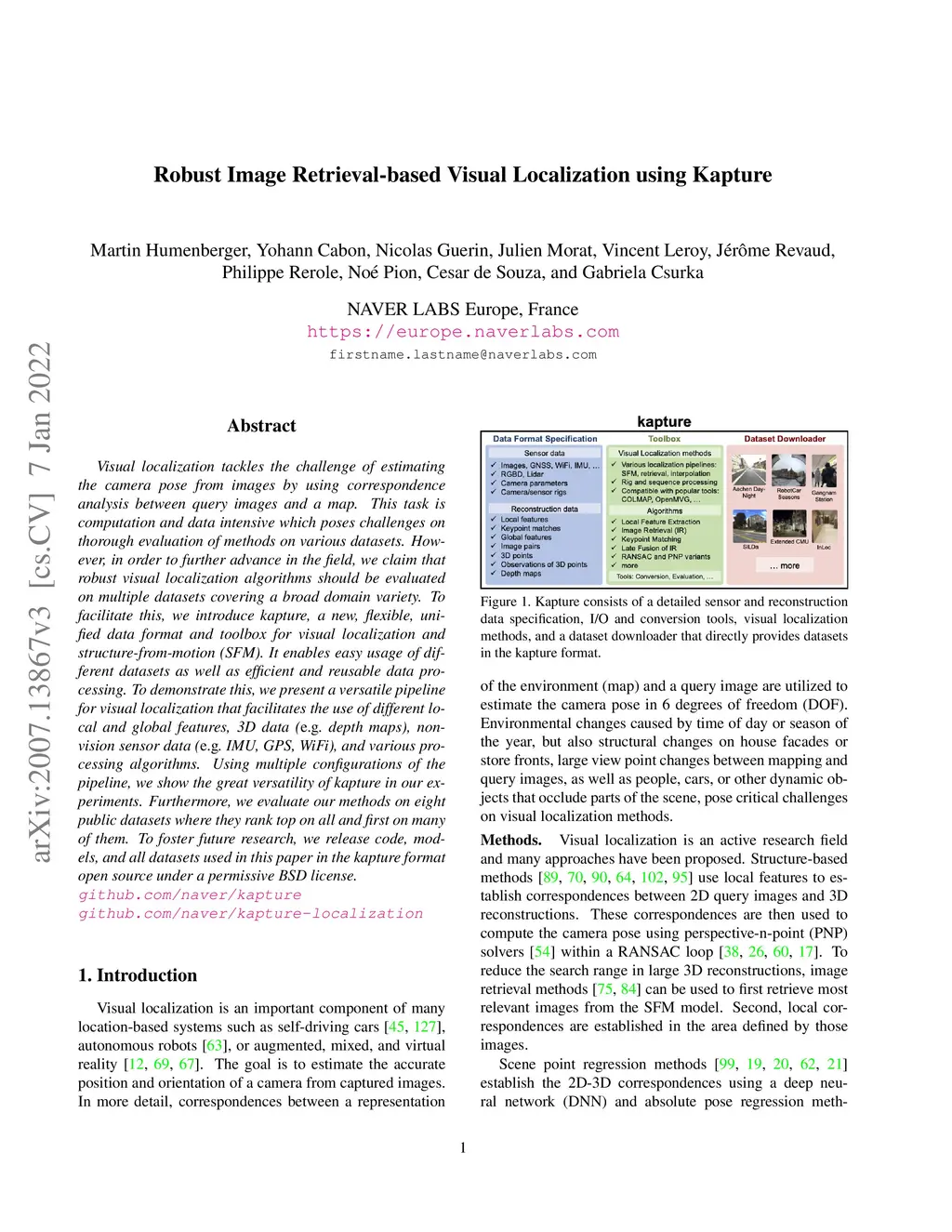 Visual localization tackles the challenge of estimating the camera pose from images by using correspondence analysis between query images and a map. This task is computation and data intensive which poses challenges on thorough evaluation of methods on various datasets. However, in order to further advance in the field, we claim that robust visual localization algorithms should be evaluated on multiple datasets covering a broad domain variety. To facilitate this, we introduce kapture, a new, flexible, unified data format and toolbox for visual localization and structure-from-motion (SFM). It enables easy usage of different datasets as well as efficient and reusable data processing. To demonstrate this, we present a versatile pipeline for visual localization that facilitates the use of different local and global features, 3D data (e.g. depth maps), non-vision sensor data (e.g. IMU, GPS, WiFi), and various processing algorithms. Using multiple configurations of the pipeline, we show the great versatility of kapture in our experiments. Furthermore, we evaluate our methods on eight public datasets where they rank top on all and first on many of them. To foster future research, we release code, models, and all datasets used in this paper in the kapture format open source under a permissive BSD license. github.com/naver/kapture, github.com/naver/kapture-localization