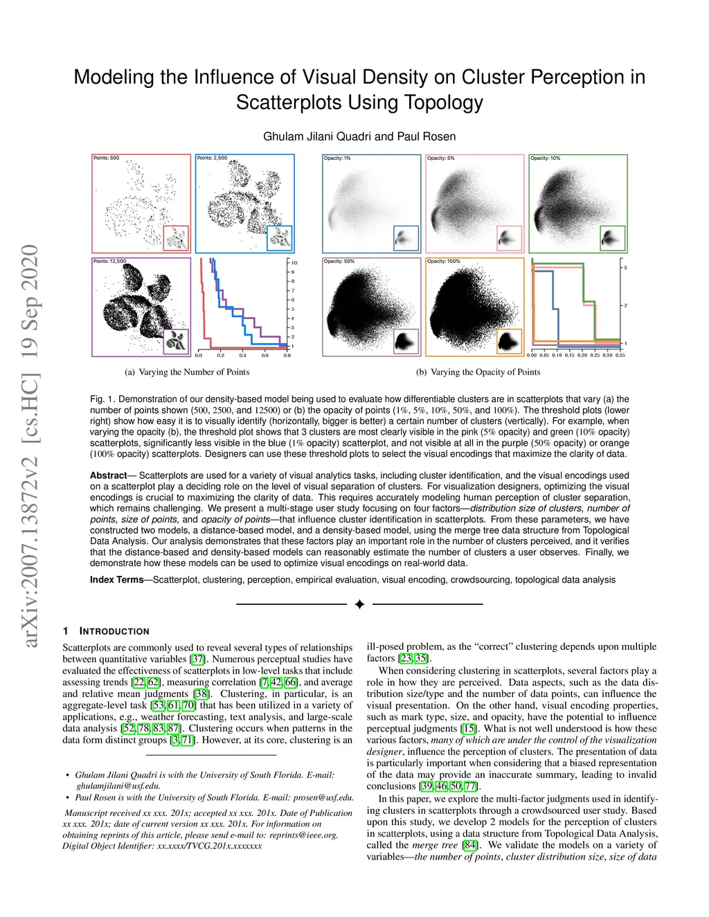 Scatterplots are used for a variety of visual analytics tasks, including cluster identification, and the visual encodings used on a scatterplot play a deciding role on the level of visual separation of clusters. For visualization designers, optimizing the visual encodings is crucial to maximizing the clarity of data. This requires accurately modeling human perception of cluster separation, which remains challenging. We present a multi-stage user study focusing on four factors---distribution size of clusters, number of points, size of points, and opacity of points---that influence cluster identification in scatterplots. From these parameters, we have constructed two models, a distance-based model, and a density-based model, using the merge tree data structure from Topological Data Analysis. Our analysis demonstrates that these factors play an important role in the number of clusters perceived, and it verifies that the distance-based and density-based models can reasonably estimate the number of clusters a user observes. Finally, we demonstrate how these models can be used to optimize visual encodings on real-world data.