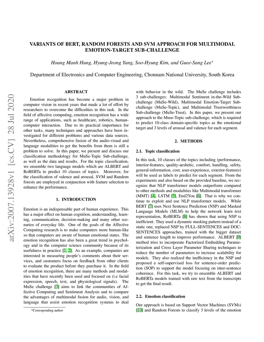 Emotion recognition has become a major problem in computer vision in recent years that made a lot of effort by researchers to overcome the difficulties in this task. In the field of affective computing, emotion recognition has a wide range of applications, such as healthcare, robotics, human-computer interaction. Due to its practical importance for other tasks, many techniques and approaches have been investigated for different problems and various data sources. Nevertheless, comprehensive fusion of the audio-visual and language modalities to get the benefits from them is still a problem to solve. In this paper, we present and discuss our classification methodology for MuSe-Topic Sub-challenge, as well as the data and results. For the topic classification, we ensemble two language models which are ALBERT and RoBERTa to predict 10 classes of topics. Moreover, for the classification of valence and arousal, SVM and Random forests are employed in conjunction with feature selection to enhance the performance.