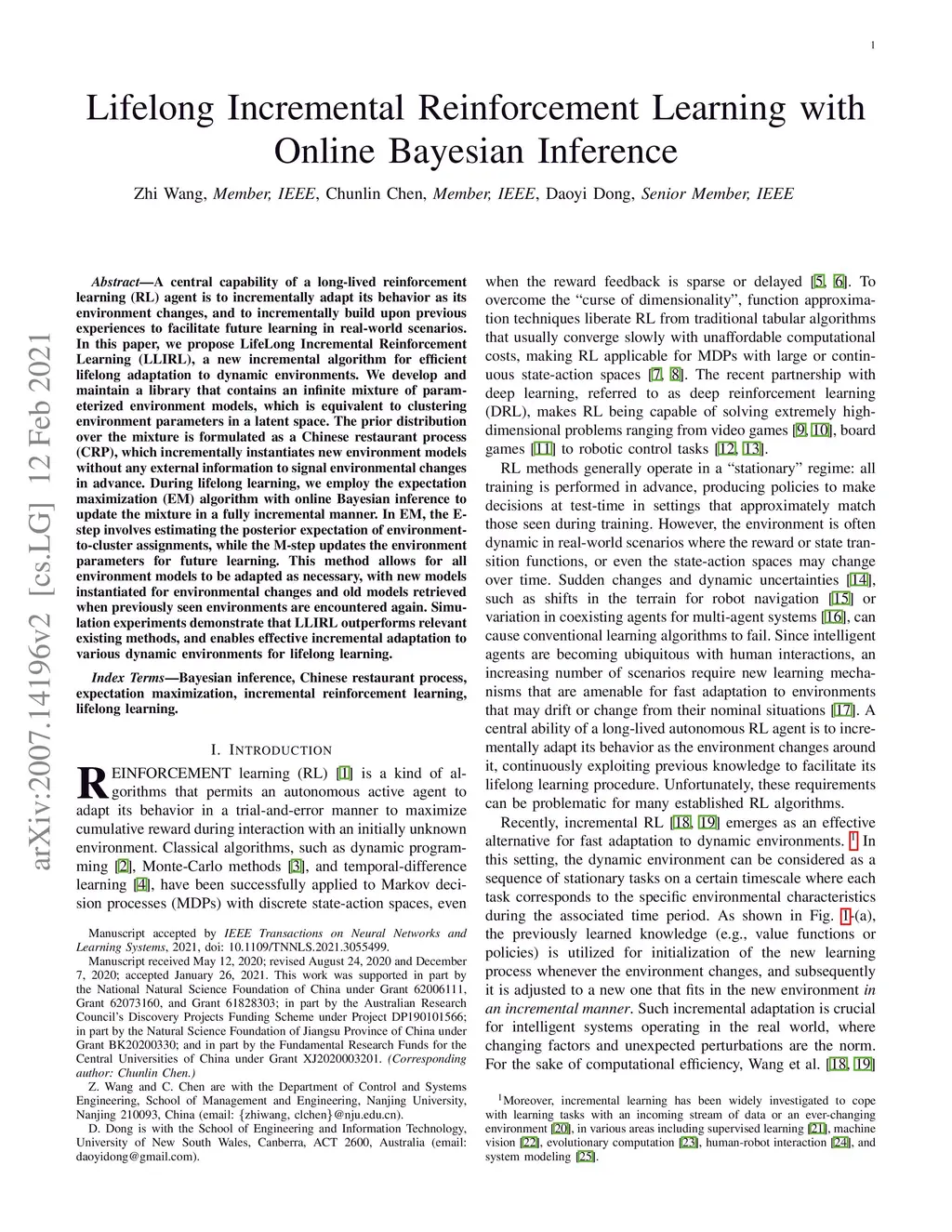 Lifelong Incremental Reinforcement Learning with Online Bayesian