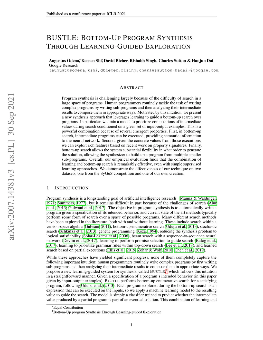 BUSTLE: Bottom-Up Program Synthesis Through Learning-Guided Exploration