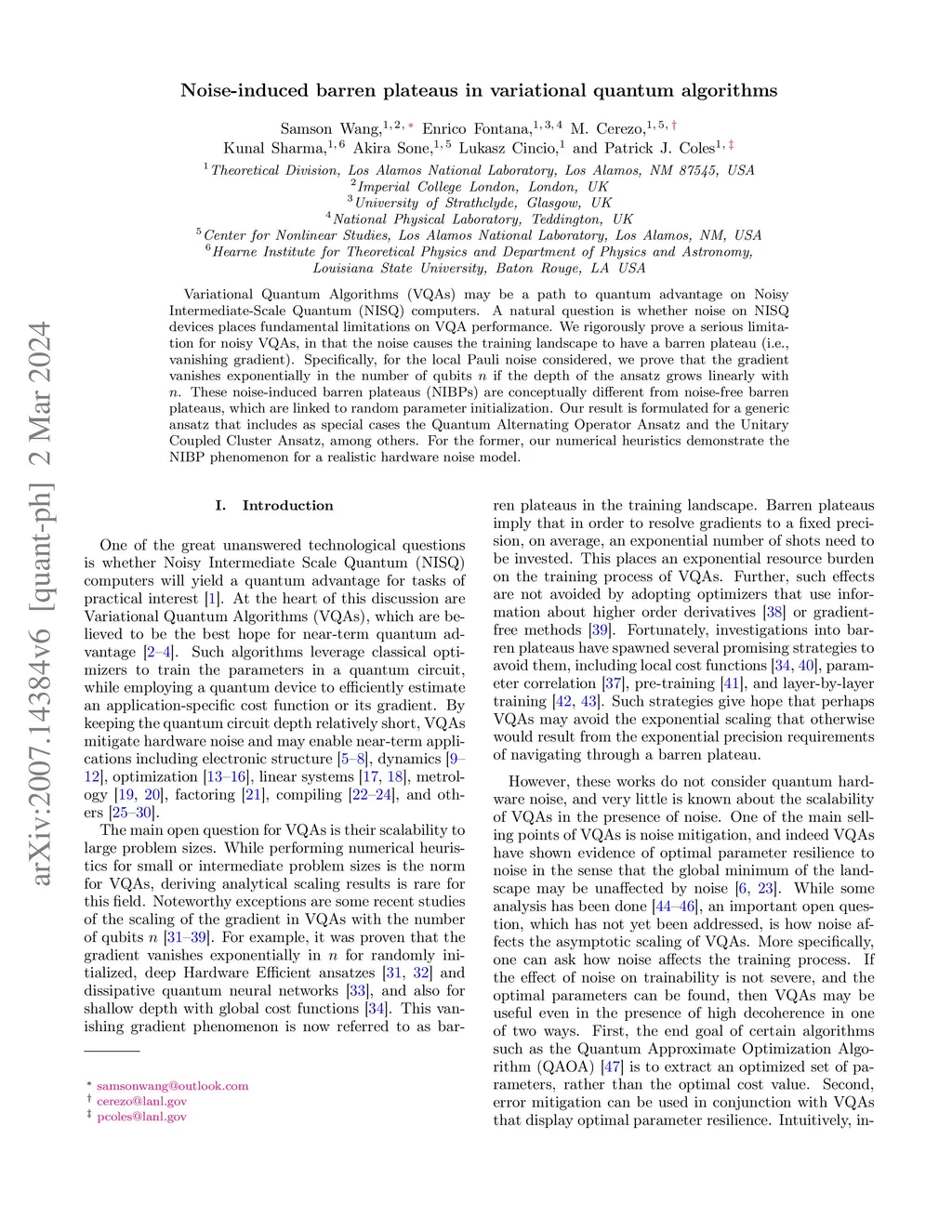 Variational Quantum Algorithms (VQAs) may be a path to quantum advantage on Noisy Intermediate-Scale Quantum (NISQ) computers. A natural question is whether noise on NISQ devices places fundamental limitations on VQA performance. We rigorously prove a serious limitation for noisy VQAs, in that the noise causes the training landscape to have a barren plateau (i.e., vanishing gradient). Specifically, for the local Pauli noise considered, we prove that the gradient vanishes exponentially in the number of qubits nn if the depth of the ansatz grows linearly with nn. These noise-induced barren plateaus (NIBPs) are conceptually different from noise-free barren plateaus, which are linked to random parameter initialization. Our result is formulated for a generic ansatz that includes as special cases the Quantum Alternating Operator Ansatz and the Unitary Coupled Cluster Ansatz, among others. For the former, our numerical heuristics demonstrate the NIBP phenomenon for a realistic hardware noise model.