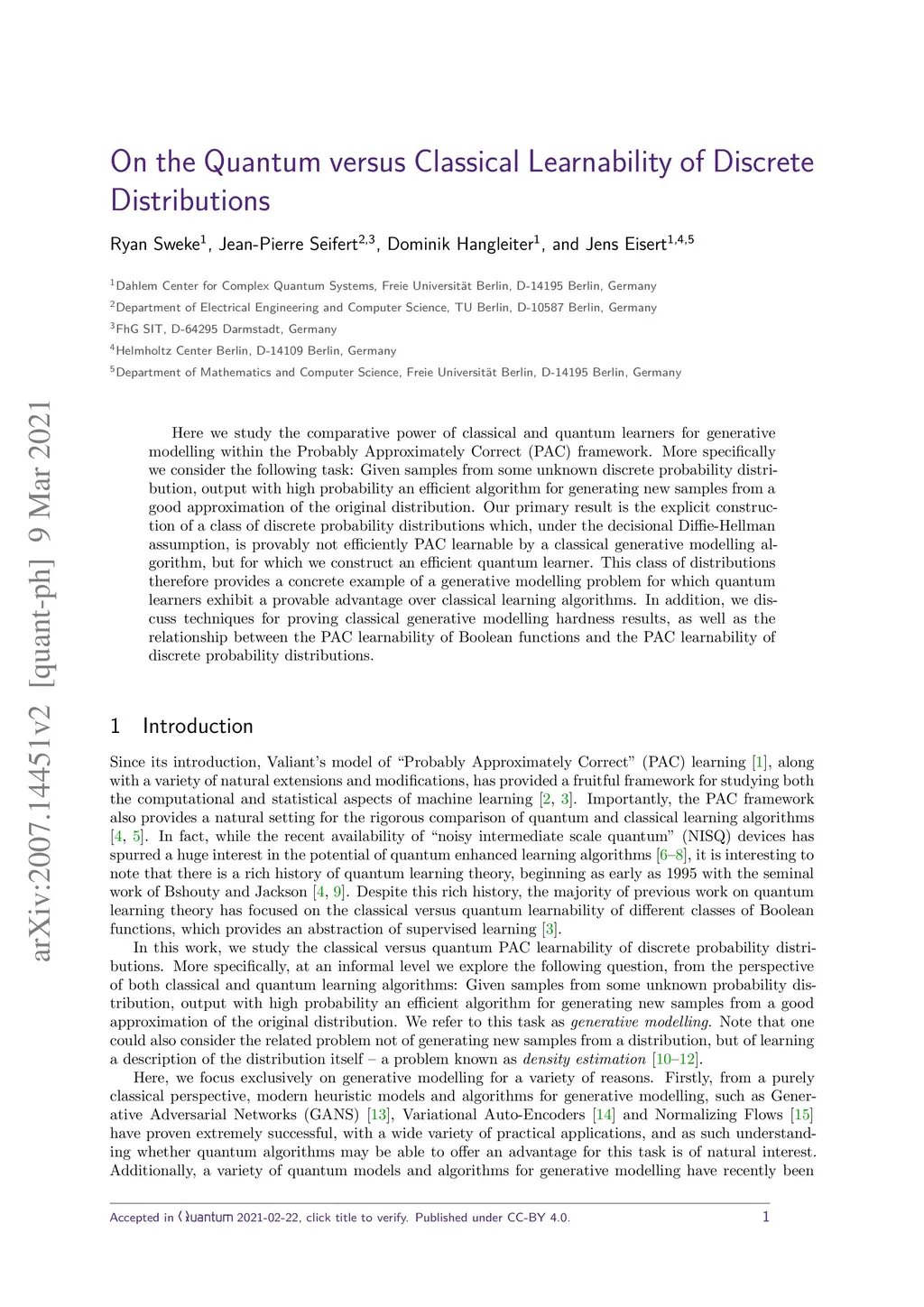 On the Quantum versus Classical Learnability of Discrete Distributions