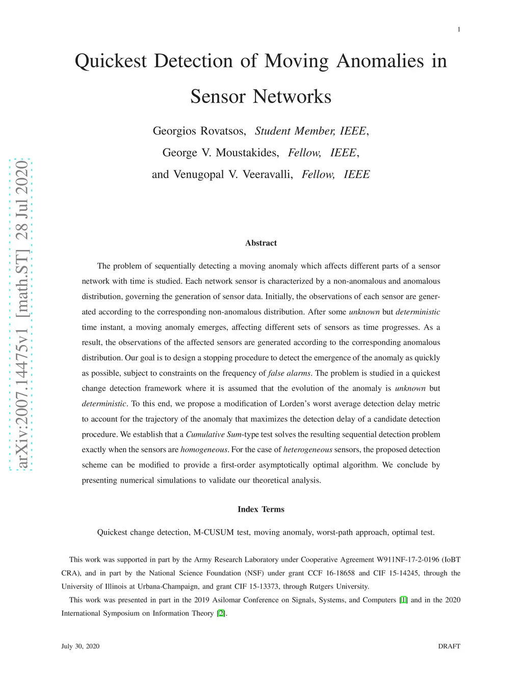 The problem of sequentially detecting a moving anomaly which affects different parts of a sensor network with time is studied. Each network sensor is characterized by a non-anomalous and anomalous distribution, governing the generation of sensor data. Initially, the observations of each sensor are generated according to the corresponding non-anomalous distribution. After some unknown but deterministic time instant, a moving anomaly emerges, affecting different sets of sensors as time progresses. As a result, the observations of the affected sensors are generated according to the corresponding anomalous distribution. Our goal is to design a stopping procedure to detect the emergence of the anomaly as quickly as possible, subject to constraints on the frequency of false alarms. The problem is studied in a quickest change detection framework where it is assumed that the evolution of the anomaly is unknown but deterministic. To this end, we propose a modification of Lorden's worst average detection delay metric to account for the trajectory of the anomaly that maximizes the detection delay of a candidate detection procedure. We establish that a Cumulative Sum-type test solves the resulting sequential detection problem exactly when the sensors are homogeneous. For the case of heterogeneous sensors, the proposed detection scheme can be modified to provide a first-order asymptotically optimal algorithm. We conclude by presenting numerical simulations to validate our theoretical analysis.
