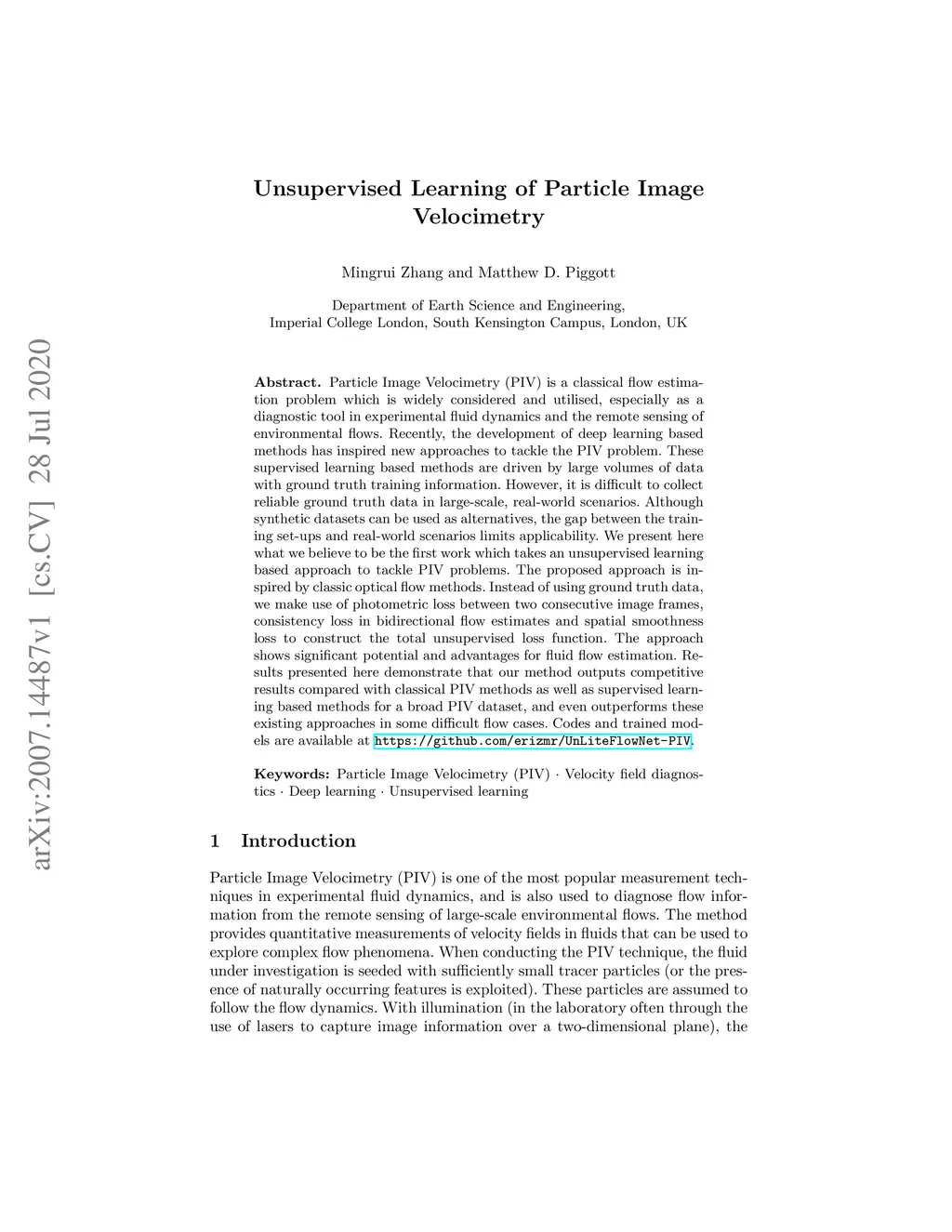 Unsupervised Learning of Particle Image Velocimetry