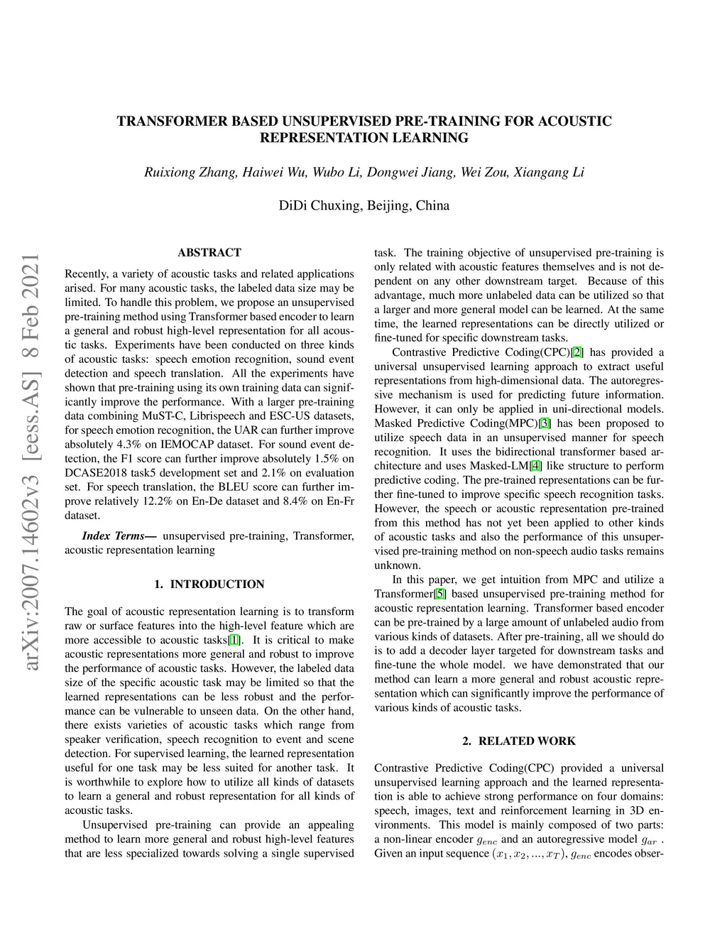 Recently, a variety of acoustic tasks and related applications arised. For many acoustic tasks, the labeled data size may be limited. To handle this problem, we propose an unsupervised pre-training method using Transformer based encoder to learn a general and robust high-level representation for all acoustic tasks. Experiments have been conducted on three kinds of acoustic tasks: speech emotion recognition, sound event detection and speech translation. All the experiments have shown that pre-training using its own training data can significantly improve the performance. With a larger pre-training data combining MuST-C, Librispeech and ESC-US datasets, for speech emotion recognition, the UAR can further improve absolutely 4.3% on IEMOCAP dataset. For sound event detection, the F1 score can further improve absolutely 1.5% on DCASE2018 task5 development set and 2.1% on evaluation set. For speech translation, the BLEU score can further improve relatively 12.2% on En-De dataset and 8.4% on En-Fr dataset.