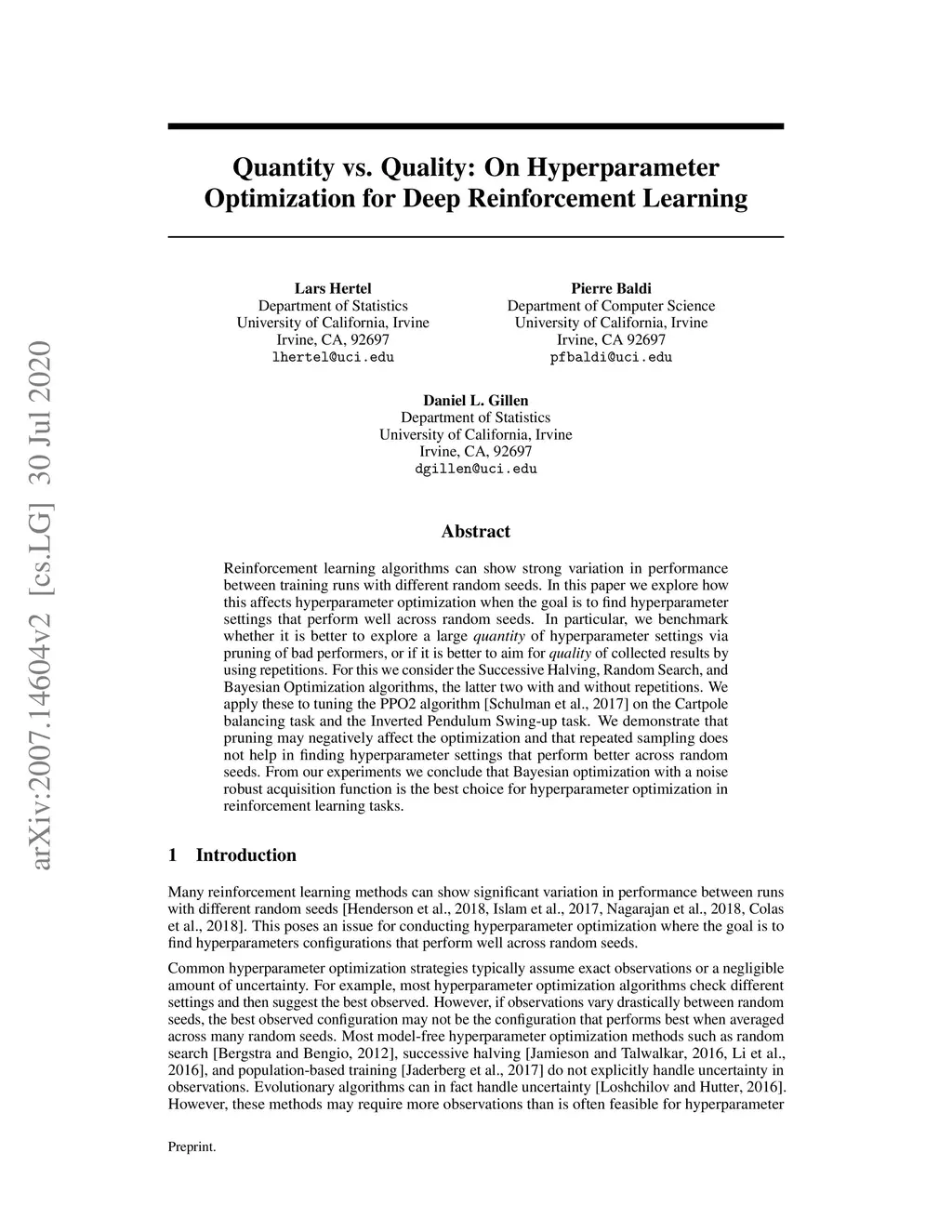 Reinforcement learning algorithms can show strong variation in performance between training runs with different random seeds. In this paper we explore how this affects hyperparameter optimization when the goal is to find hyperparameter settings that perform well across random seeds. In particular, we benchmark whether it is better to explore a large quantity of hyperparameter settings via pruning of bad performers, or if it is better to aim for quality of collected results by using repetitions. For this we consider the Successive Halving, Random Search, and Bayesian Optimization algorithms, the latter two with and without repetitions. We apply these to tuning the PPO2 algorithm on the Cartpole balancing task and the Inverted Pendulum Swing-up task. We demonstrate that pruning may negatively affect the optimization and that repeated sampling does not help in finding hyperparameter settings that perform better across random seeds. From our experiments we conclude that Bayesian optimization with a noise robust acquisition function is the best choice for hyperparameter optimization in reinforcement learning tasks.