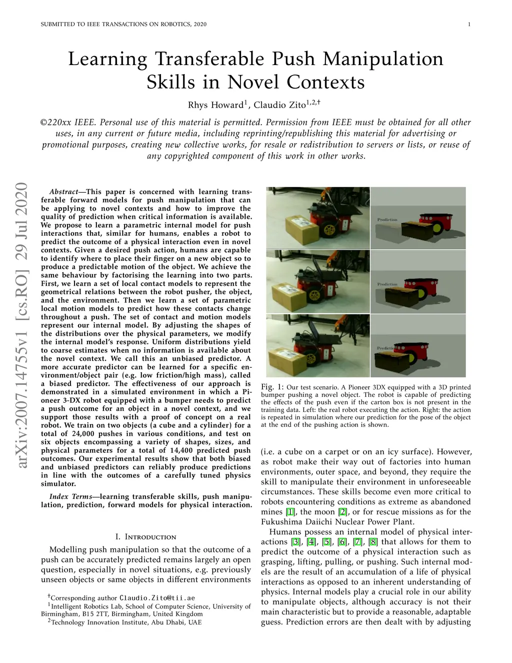 This paper is concerned with learning transferable forward models for push manipulation that can be applying to novel contexts and how to improve the quality of prediction when critical information is available. We propose to learn a parametric internal model for push interactions that, similar for humans, enables a robot to predict the outcome of a physical interaction even in novel contexts. Given a desired push action, humans are capable to identify where to place their finger on a new object so to produce a predictable motion of the object. We achieve the same behaviour by factorising the learning into two parts. First, we learn a set of local contact models to represent the geometrical relations between the robot pusher, the object, and the environment. Then we learn a set of parametric local motion models to predict how these contacts change throughout a push. The set of contact and motion models represent our internal model. By adjusting the shapes of the distributions over the physical parameters, we modify the internal model's response. Uniform distributions yield to coarse estimates when no information is available about the novel context (i.e. unbiased predictor). A more accurate predictor can be learned for a specific environment/object pair (e.g. low friction/high mass), i.e. biased predictor. The effectiveness of our approach is shown in a simulated environment in which a Pioneer 3-DX robot needs to predict a push outcome for a novel object, and we provide a proof of concept on a real robot. We train on 2 objects (a cube and a cylinder) for a total of 24,000 pushes in various conditions, and test on 6 objects encompassing a variety of shapes, sizes, and physical parameters for a total of 14,400 predicted push outcomes. Our results show that both biased and unbiased predictors can reliably produce predictions in line with the outcomes of a carefully tuned physics simulator.